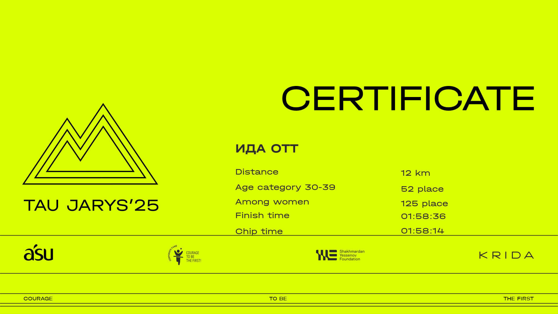 | 502 | Saniya Edelbay | ![]() | Алматы | 428 | 00:14:16.00 | 00:38:13.90 | 00:50:58.30 | 01:16:26.90 | 01:40:09.90 | 01:52:17.30 | 02:02:09.40 | 02:02:04.90 | Download |