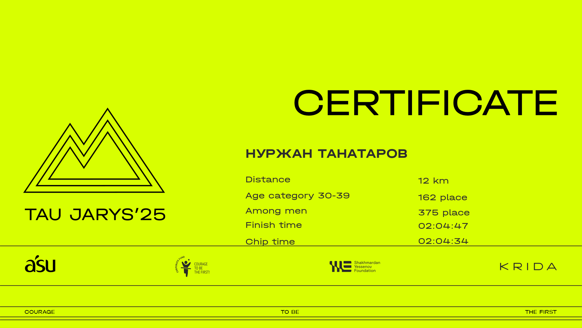 | 508 | Нуржан Танатаров | ![]() | Алматы | 167 | 00:13:35.80 | 00:38:44.30 | 00:50:09.30 | 01:15:01.80 | 01:41:17.90 | 01:53:23.60 | 02:04:47.90 | 02:04:34.60 | Download |