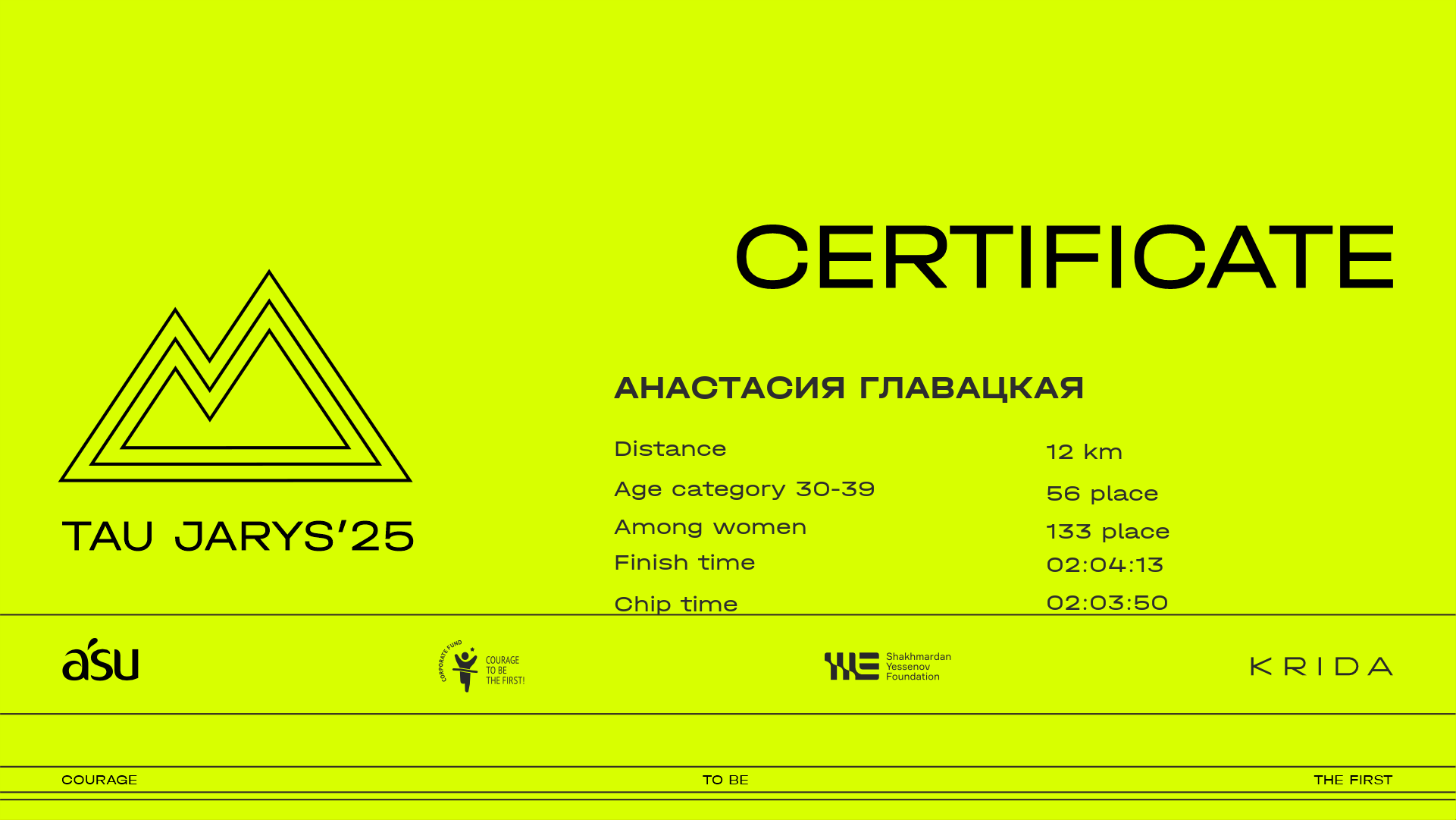 | 516 | Bahar Chalak | ![]() | Алматы | 158 | 00:14:50.00 | 00:39:17.90 | 00:51:17.50 | 01:18:19.00 | 01:44:15.70 | 01:57:17.20 | 02:08:30.00 | 02:08:23.70 | Download |