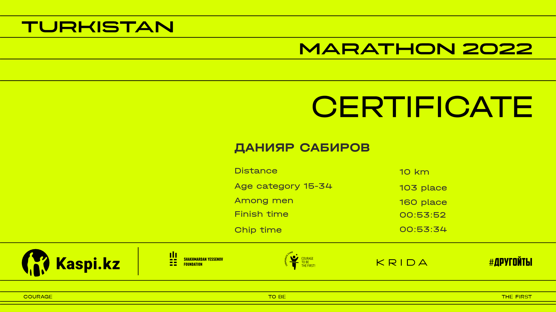 | 469 | Даурен Каллашович | ![]() | Шымкент | 1469 | 01:06:47.73 | 01:06:47.21 | Download | |