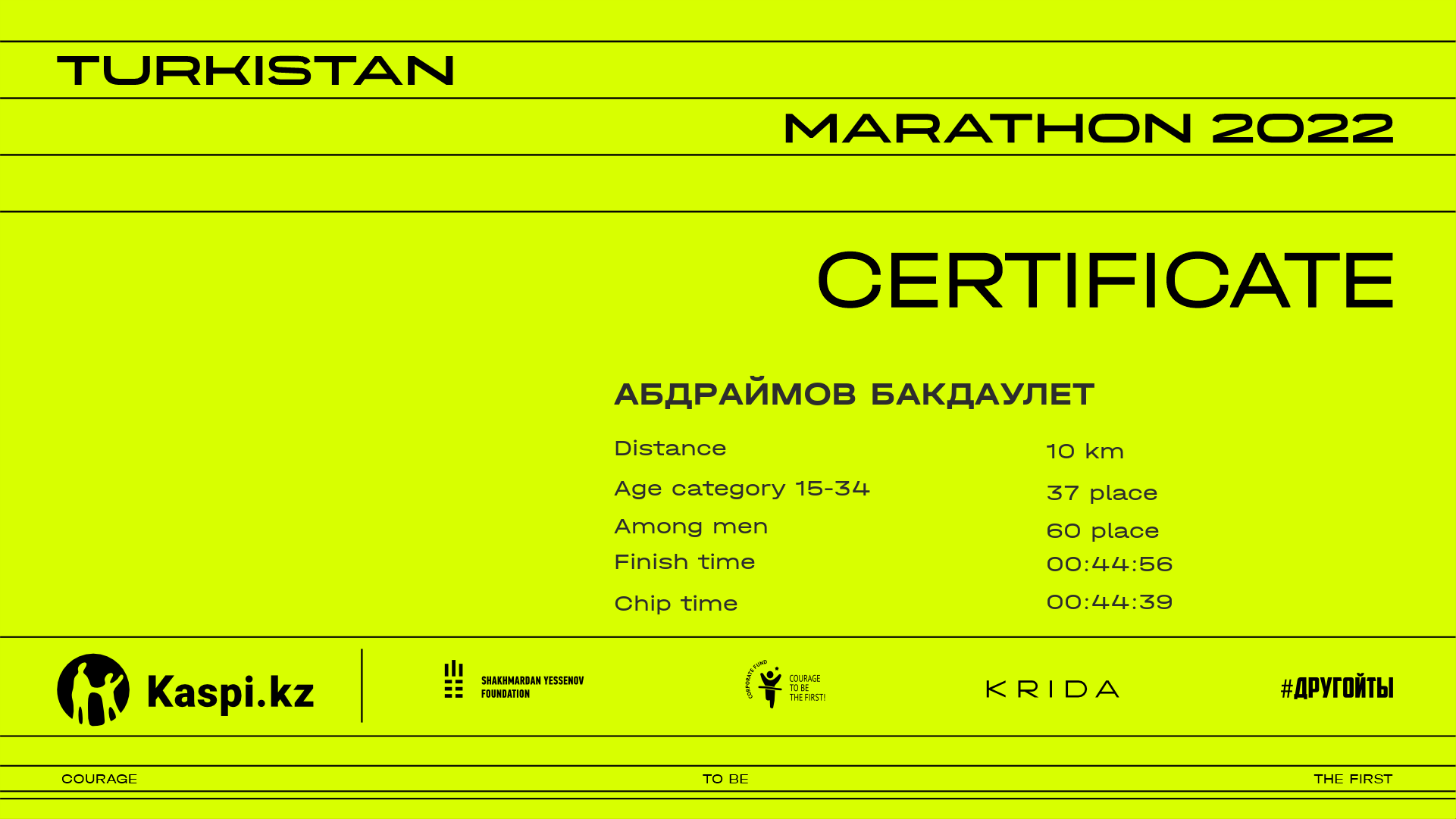 | 69 | BOLAT YESKENDER | ![]() | Алматы | 1321 | 00:22:19.77 | 00:44:57.91 | 00:44:57.91 | Download |