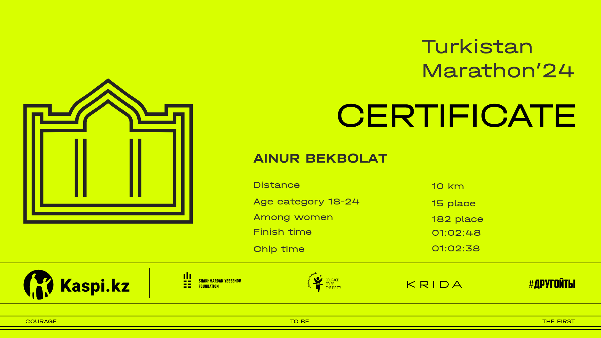 | 1200 | Akerke Kuanysheva | ![]() | Ақтөбе | 1824 | 00:47:51 | 01:36:23 | 01:35:26 | Download |