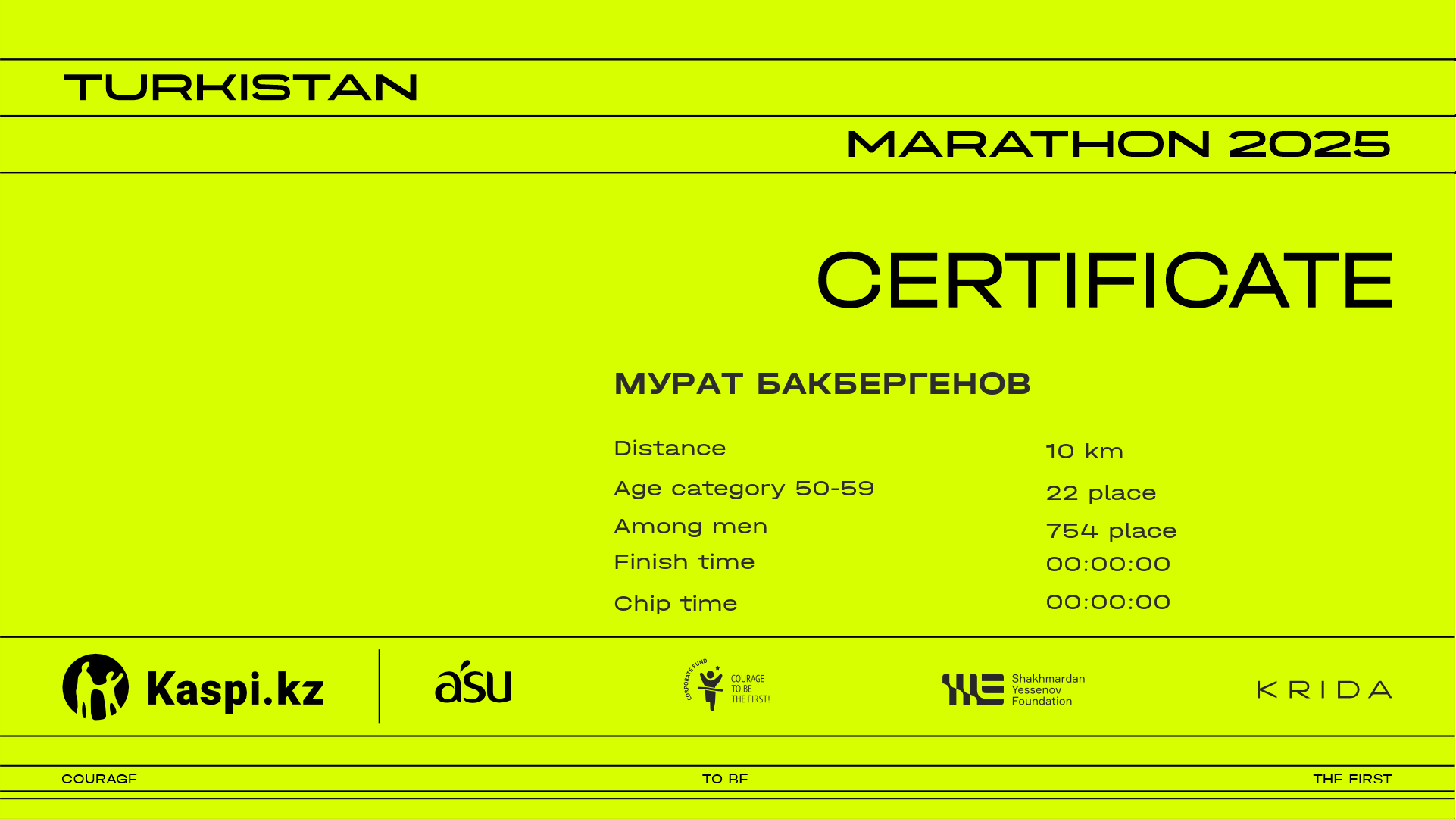 | 660 | Мухамаддин Турсунбаев | ![]() | Туркестан | 2303 | 00:38:04 | 01:02:31 | 01:02:11 | Download |