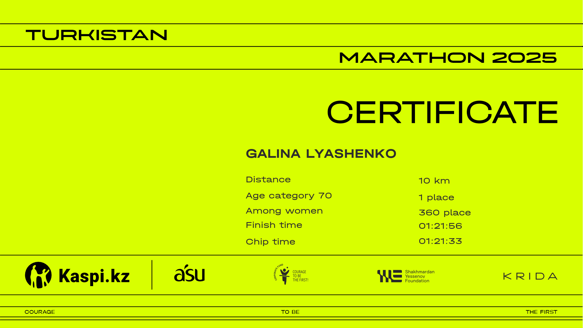 | 1084 | Aydana Ilesbekova | ![]() | Шымкент | 2361 | 00:51:58 | 01:27:03 | 01:26:25 | Download |
