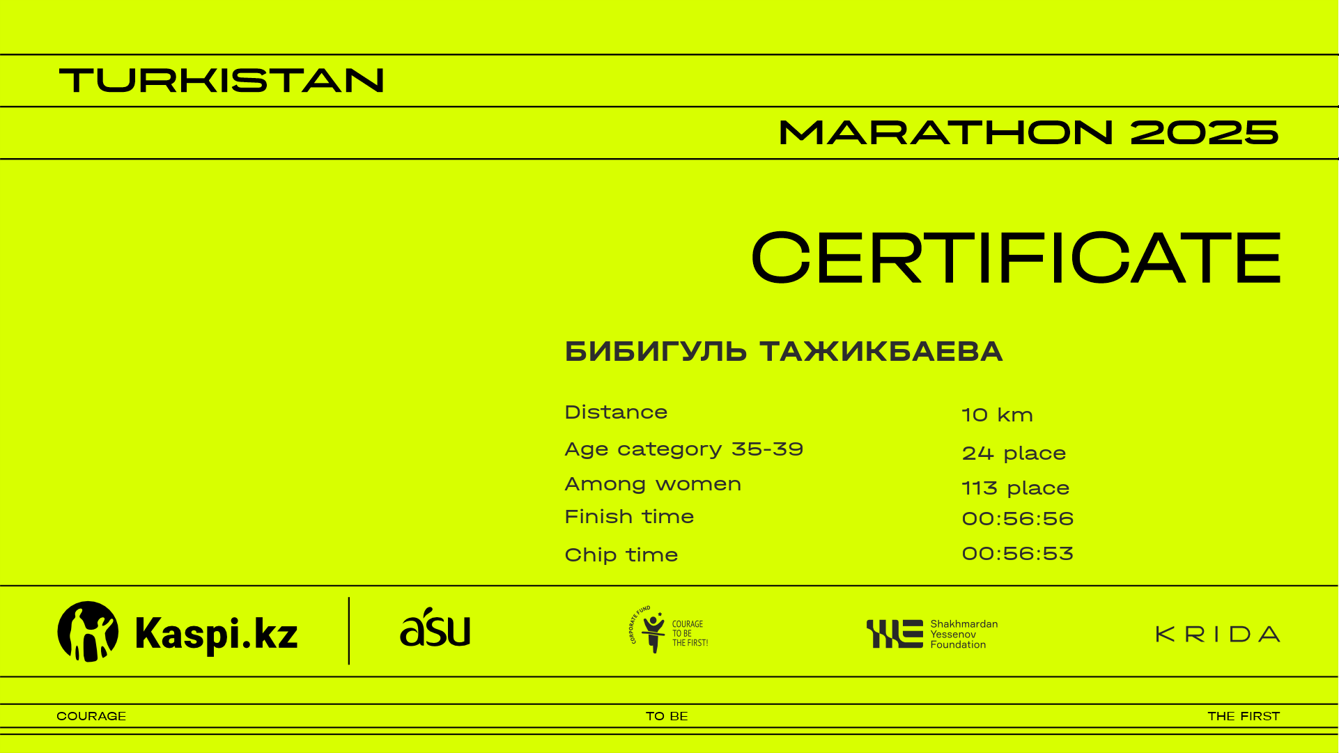 | 1069 | Айзат Сулейменова | ![]() | Алматы | 1125 | 00:53:03 | 01:25:23 | 01:24:33 | Download |