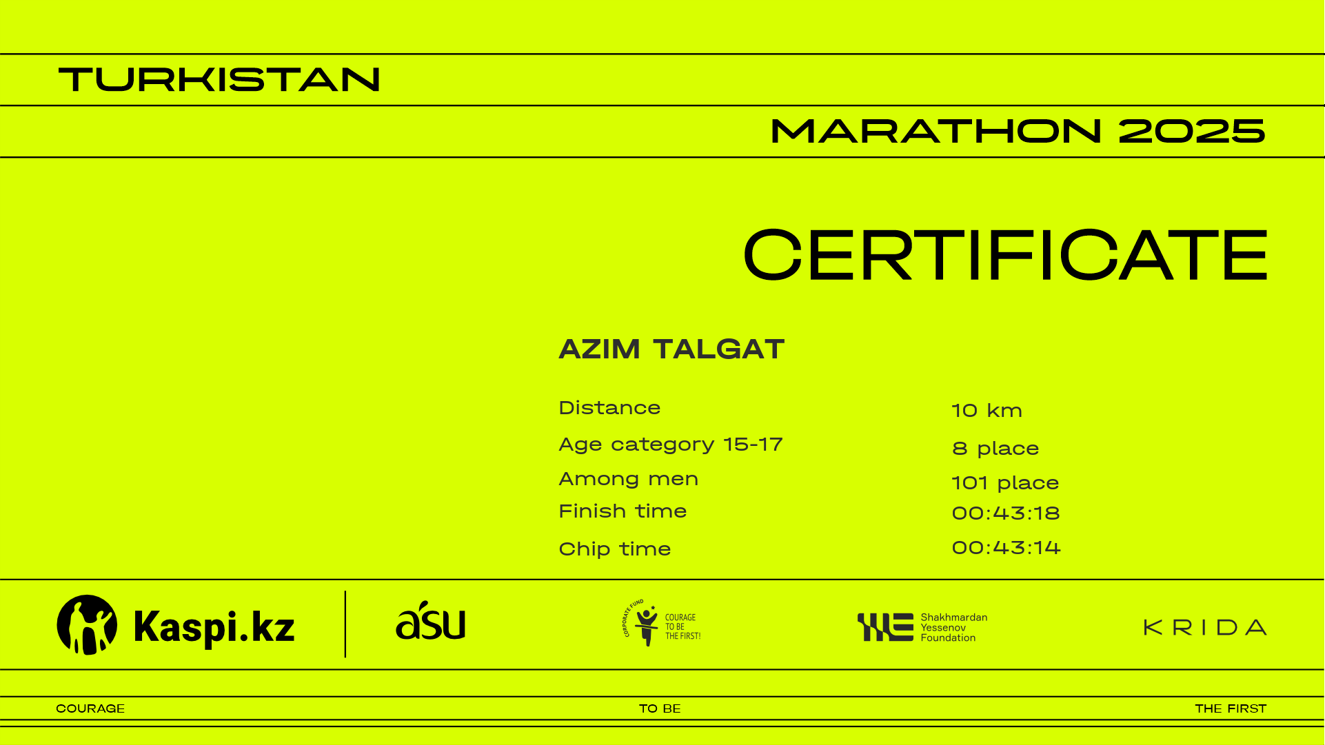 | 112 | Azim Talgat | ![]() | Актобе | 1114 | 00:27:02 | 00:43:18 | 00:43:14 | Download |
