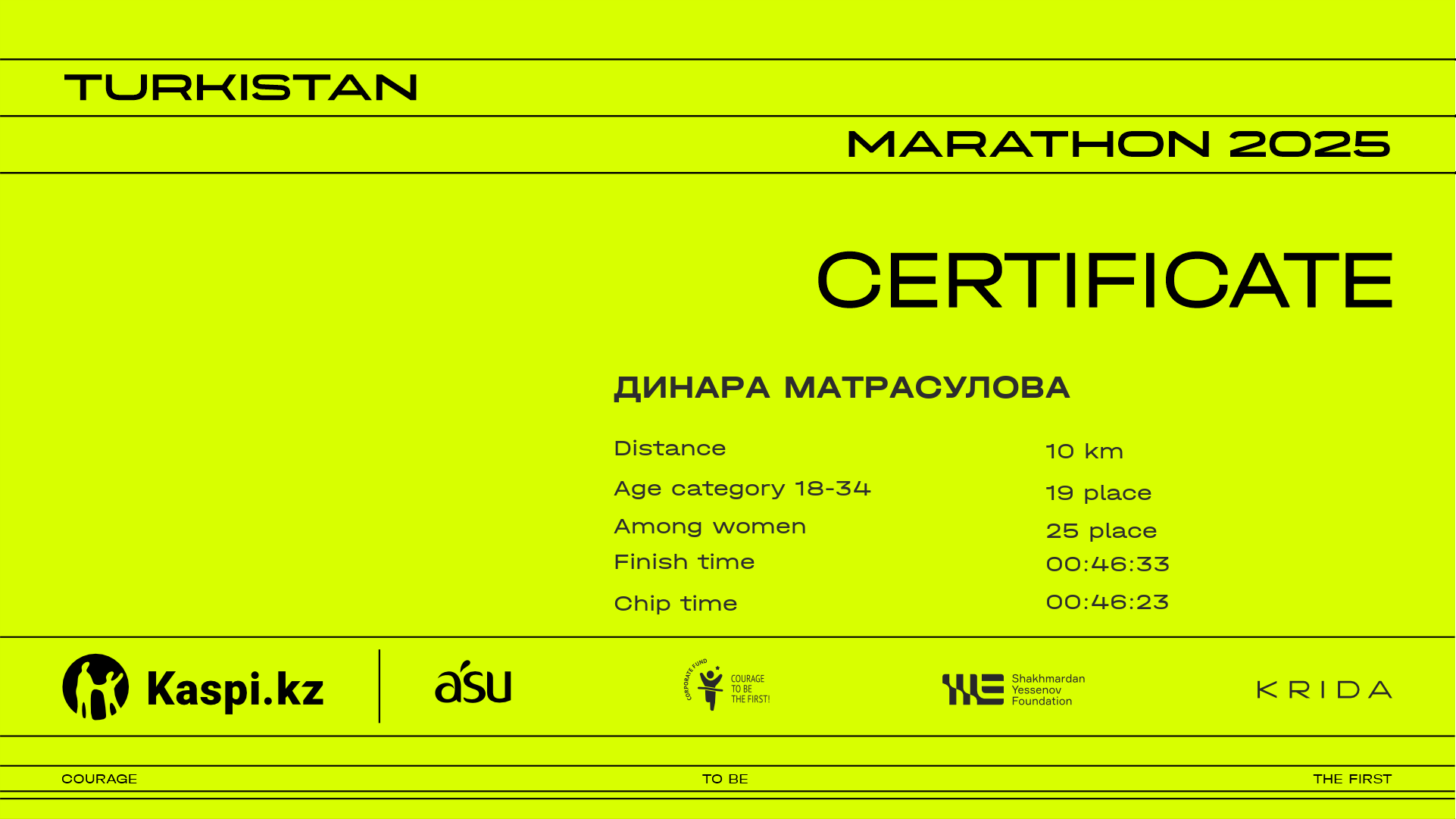 | 157 | Assel Zhandeldina | ![]() | Алматы | 1055 | 00:28:46 | 00:46:19 | 00:46:13 | Download |
