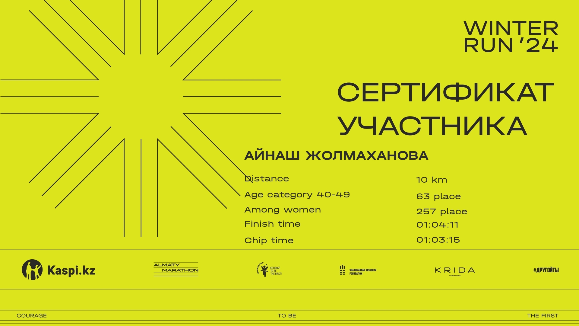 | 1549 | Botagoz Kudekova | ![]() | Алматы | 1721 | 01:00:31 | 01:14:26 | 01:14:26 | Download | ||