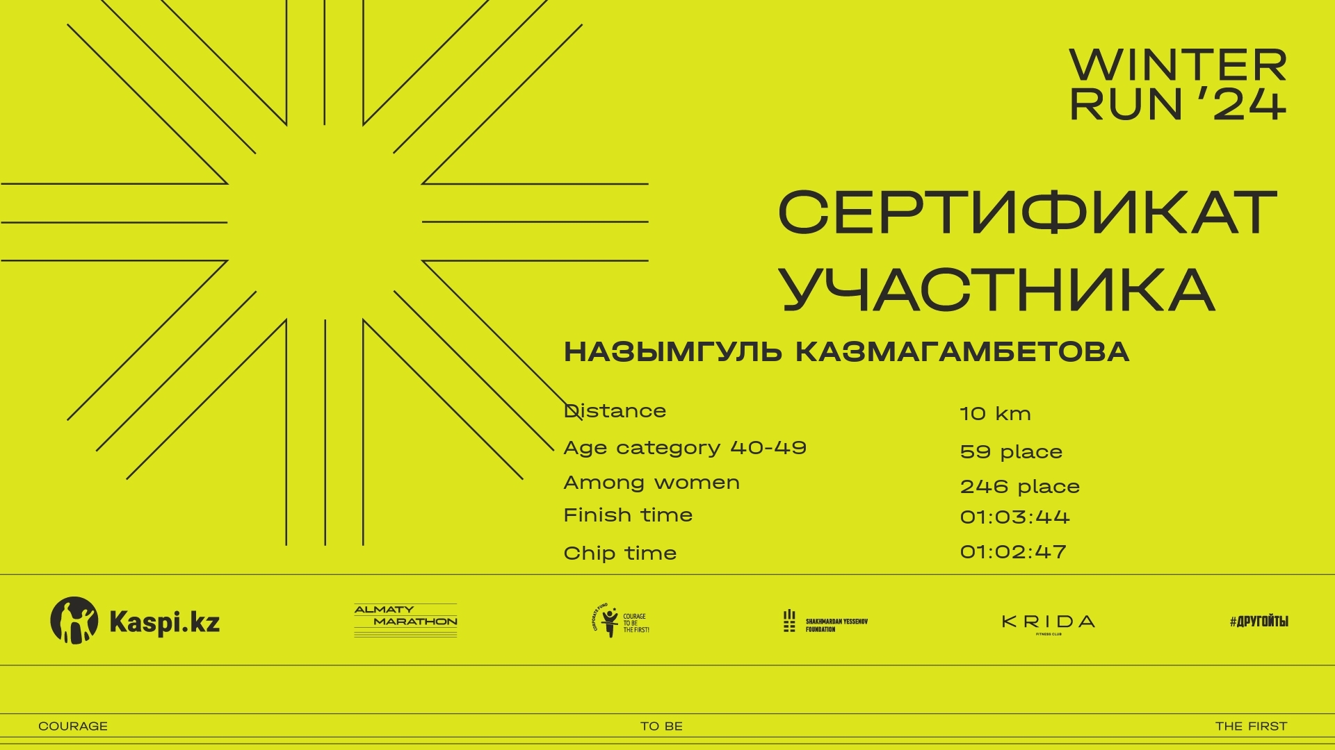 | 1332 | Алтынбек Камалов | ![]() | Алматы | 112 | 00:10:43 | 00:35:00 | 00:58:02 | 01:08:17 | 01:07:32 | Download |