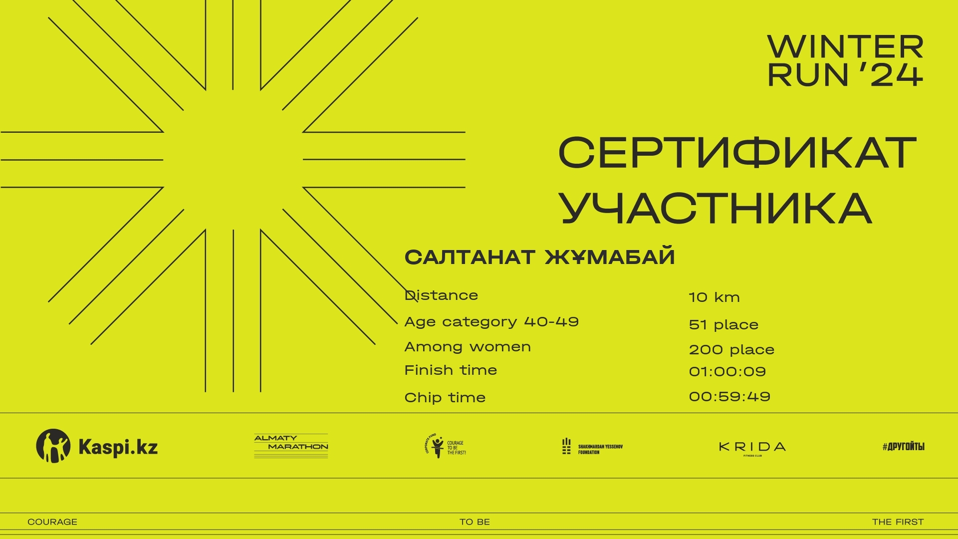 | 1663 | Салтанат Шурабекова | ![]() | Алматы | 1099 | 00:11:56 | 00:40:46 | 01:07:12 | 01:20:17 | 01:19:07 | Download |