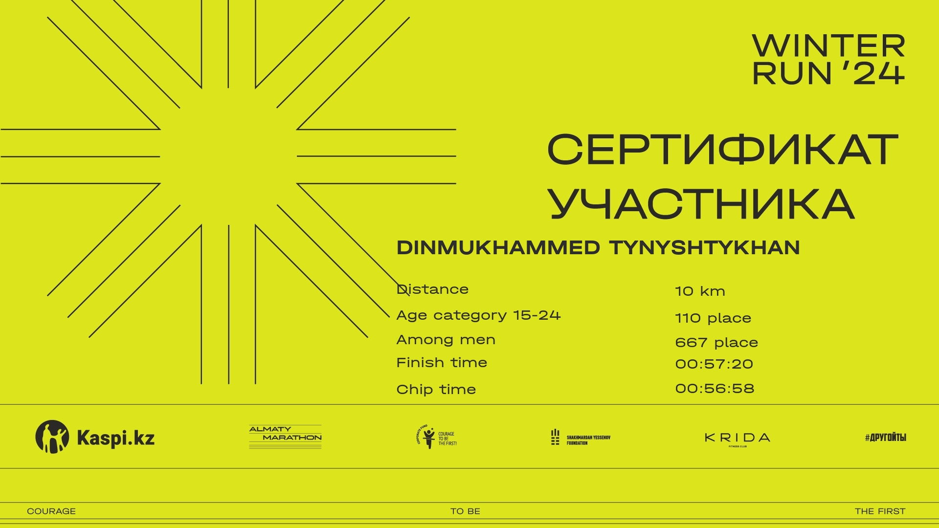 | 168 | Erasyl Tagaev | ![]() | Almaty | 680 | 00:06:10 | 00:22:19 | 00:36:48 | 00:44:03 | 00:43:48 | Download |