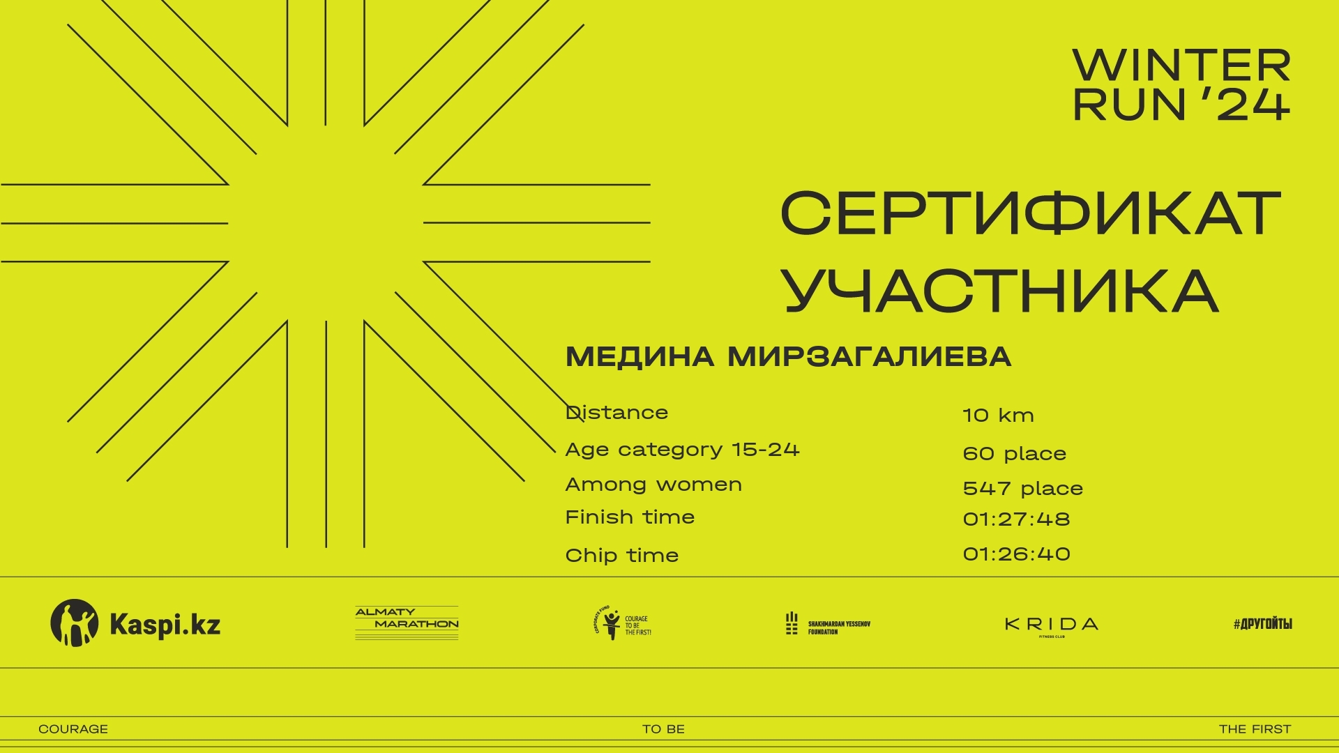 | 1791 | Айнагуль Ералиева | ![]() | Алматы | 34 | 00:12:34 | 00:48:17 | 01:18:26 | 01:34:03 | 01:33:30 | Download |