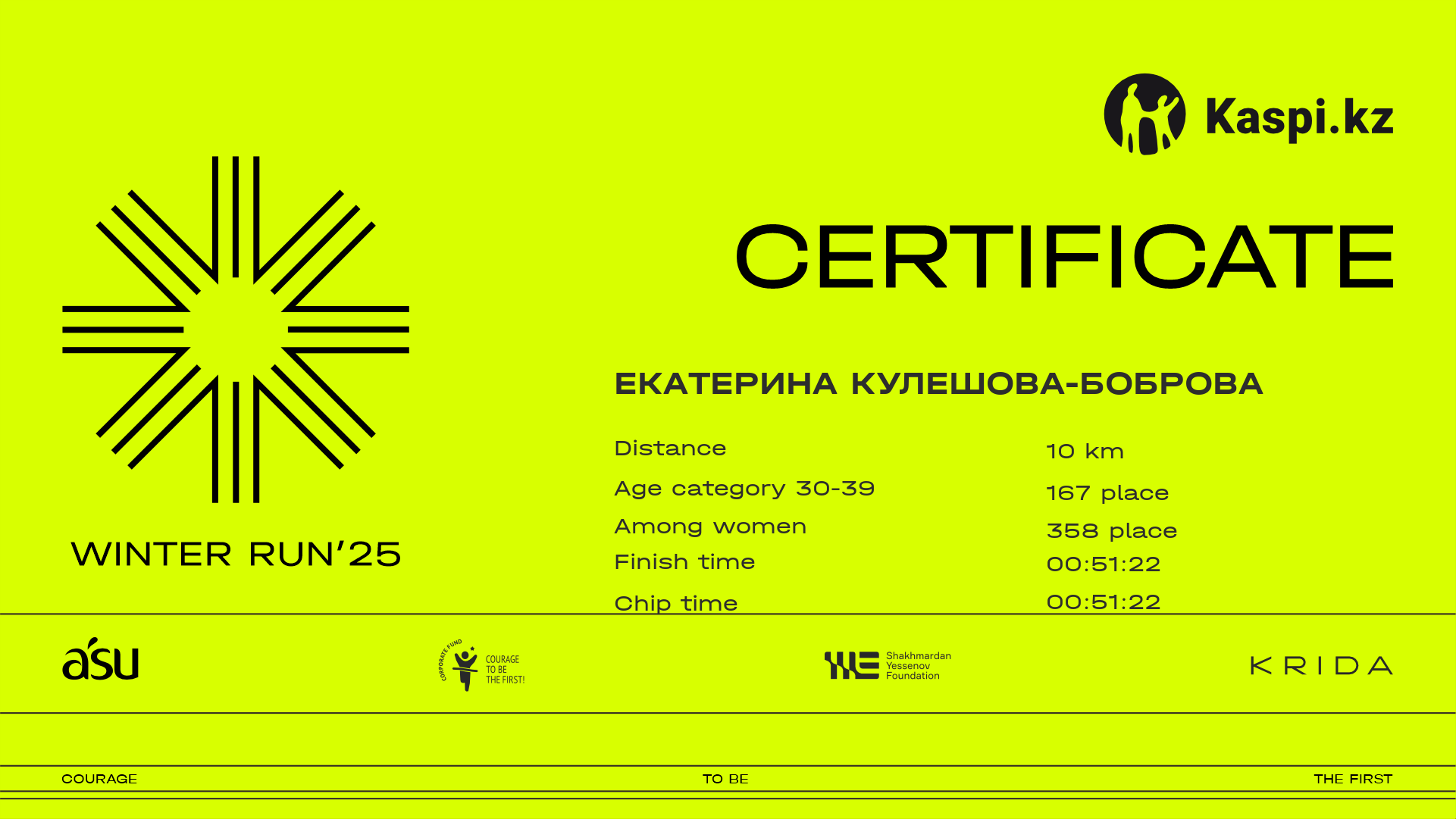 | 1200 | Екатерина Кулешова-Боброва | ![]() | Алматы | 1267 | 00:30:16 | 00:51:22 | 01:10:05 | 01:09:22 | Download |