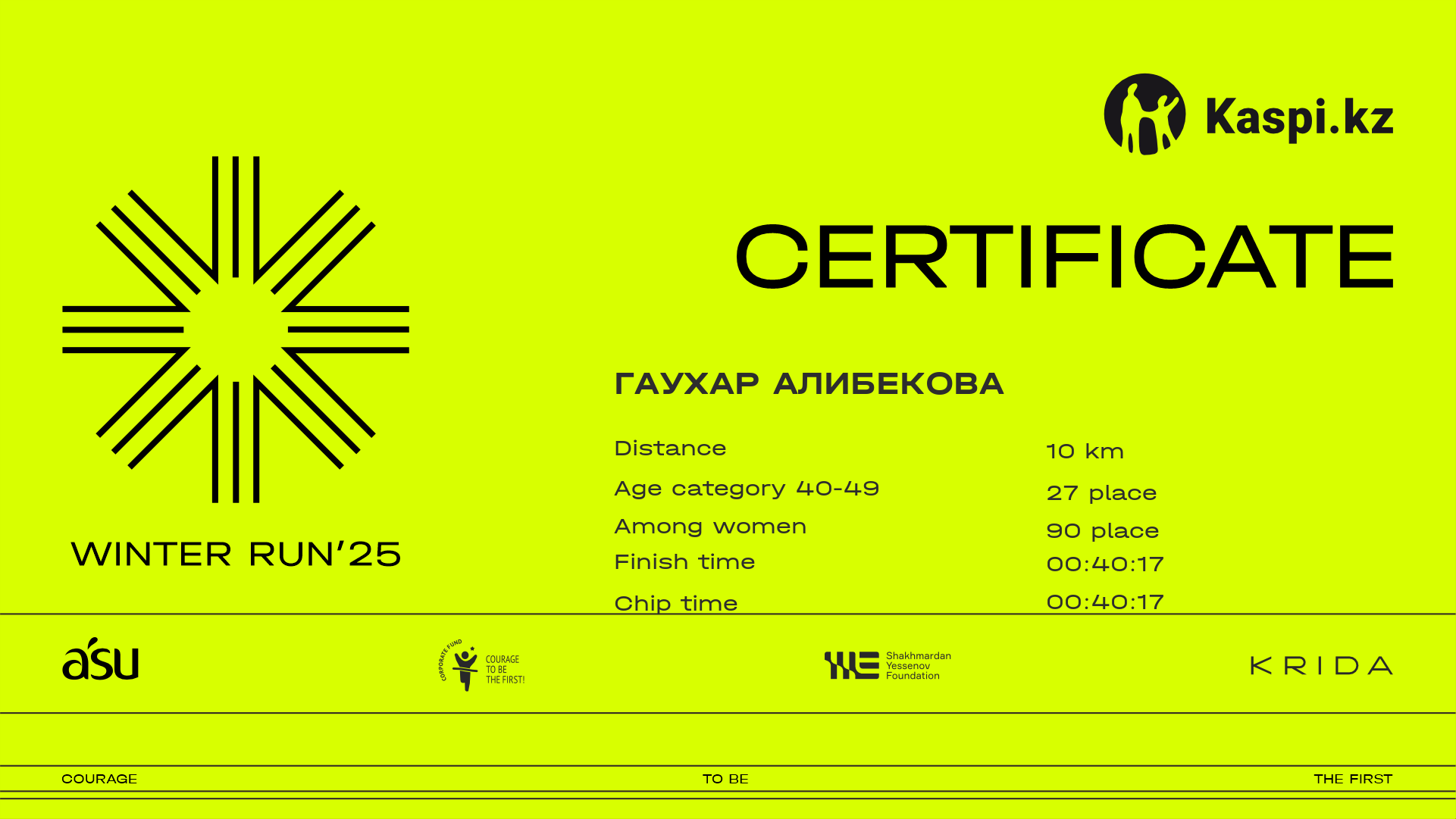 | 1602 | Айнур Жесекбаева | ![]() | Алматы | 1730 | 00:36:44 | 01:06:39 | 01:34:03 | 01:33:11 | Download |