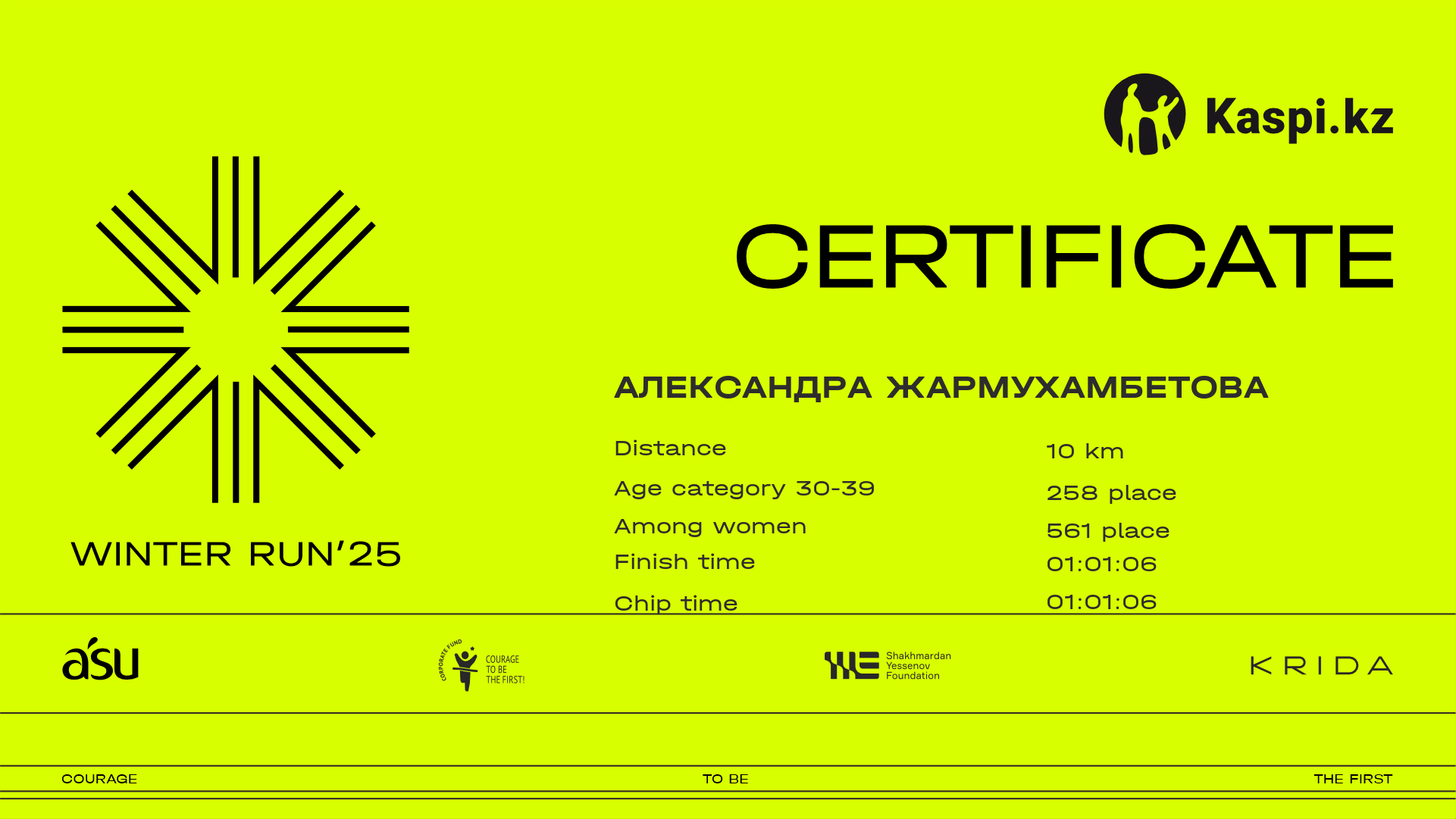 | 1534 | Айгерим Кайсенова | ![]() | Алматы | 778 | 00:33:52 | 01:01:18 | 01:25:23 | 01:24:16 | Download |