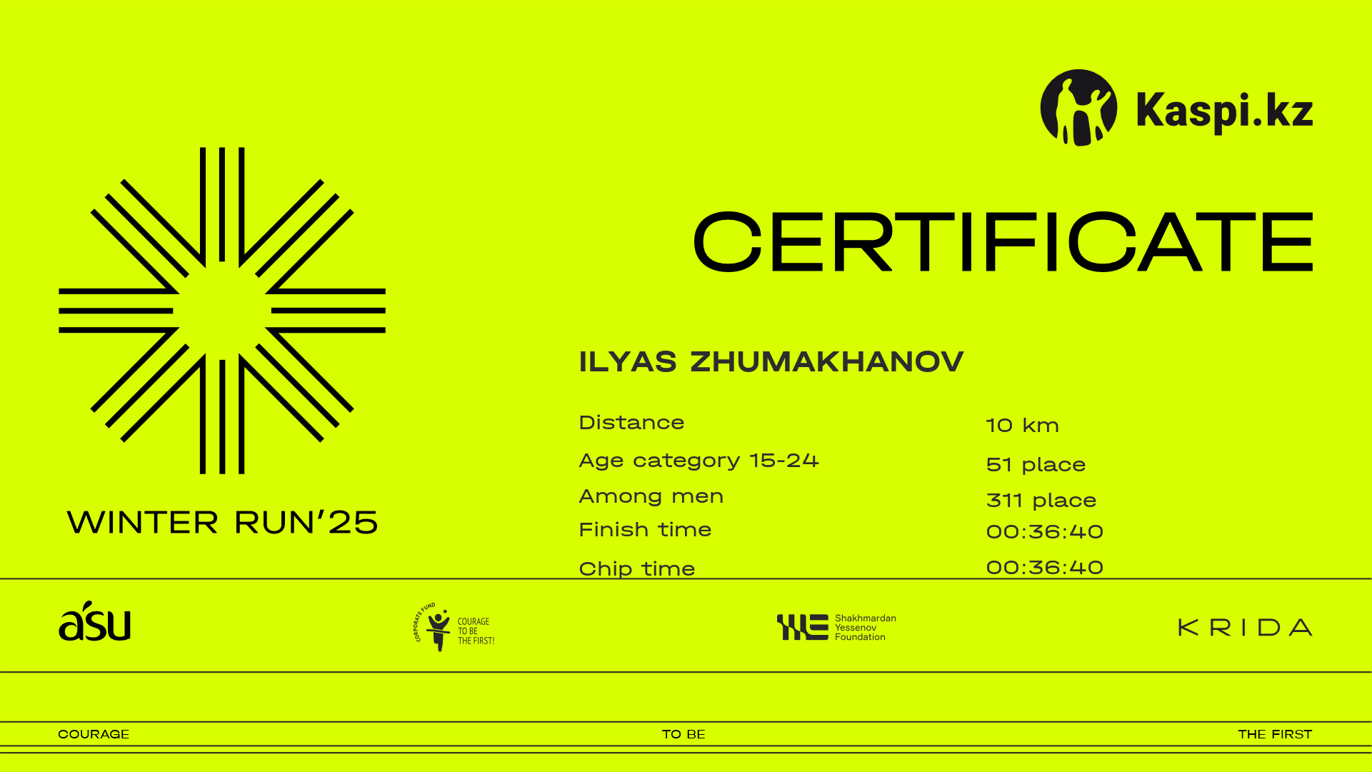 | 366 | Ilyas Zhumakhanov | ![]() | Алматы | 302 | 00:20:25 | 00:36:40 | 00:51:11 | 00:50:58 | Download |