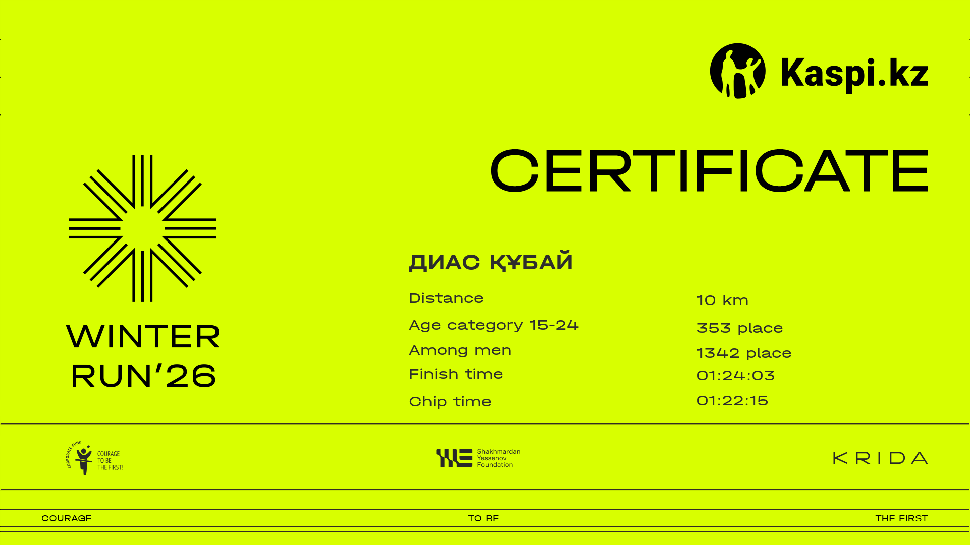 | 1935 | Диас Құбай | ![]() | Алматы | 296 | 00:12:50.47 | 00:43:51.93 | 01:11:25.94 | 01:24:03.77 | 01:22:15.03 | Download |