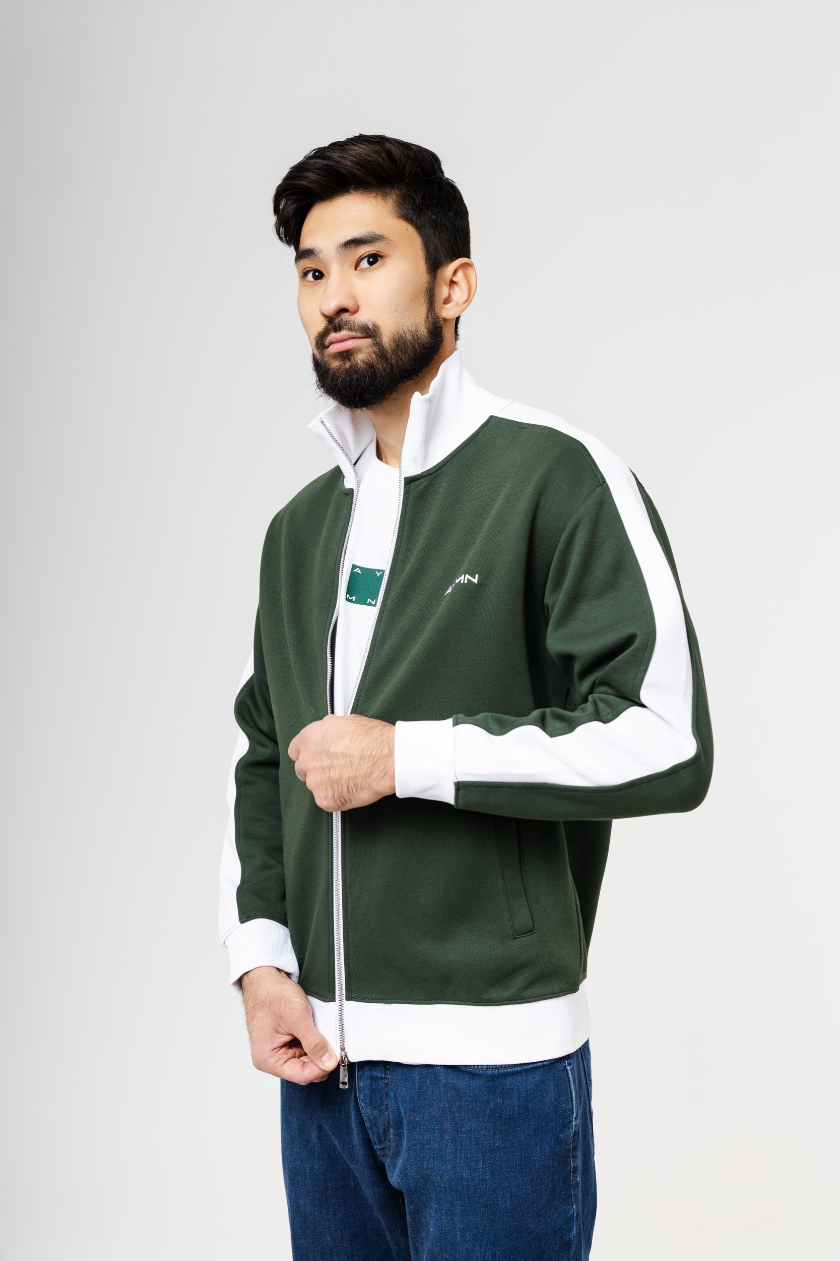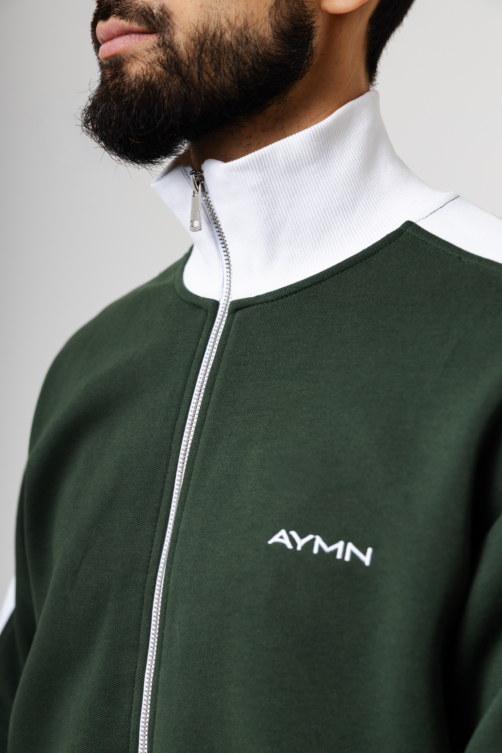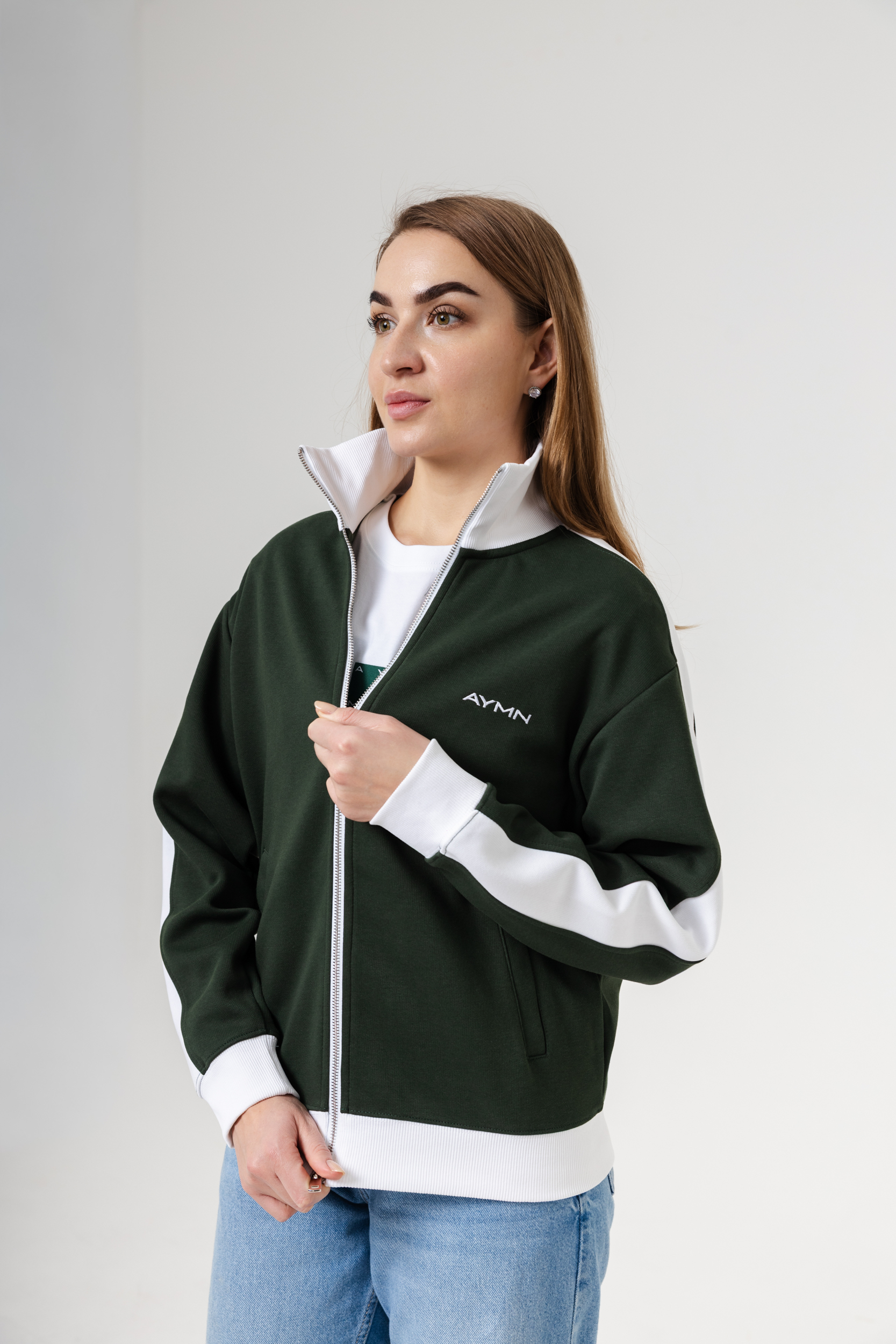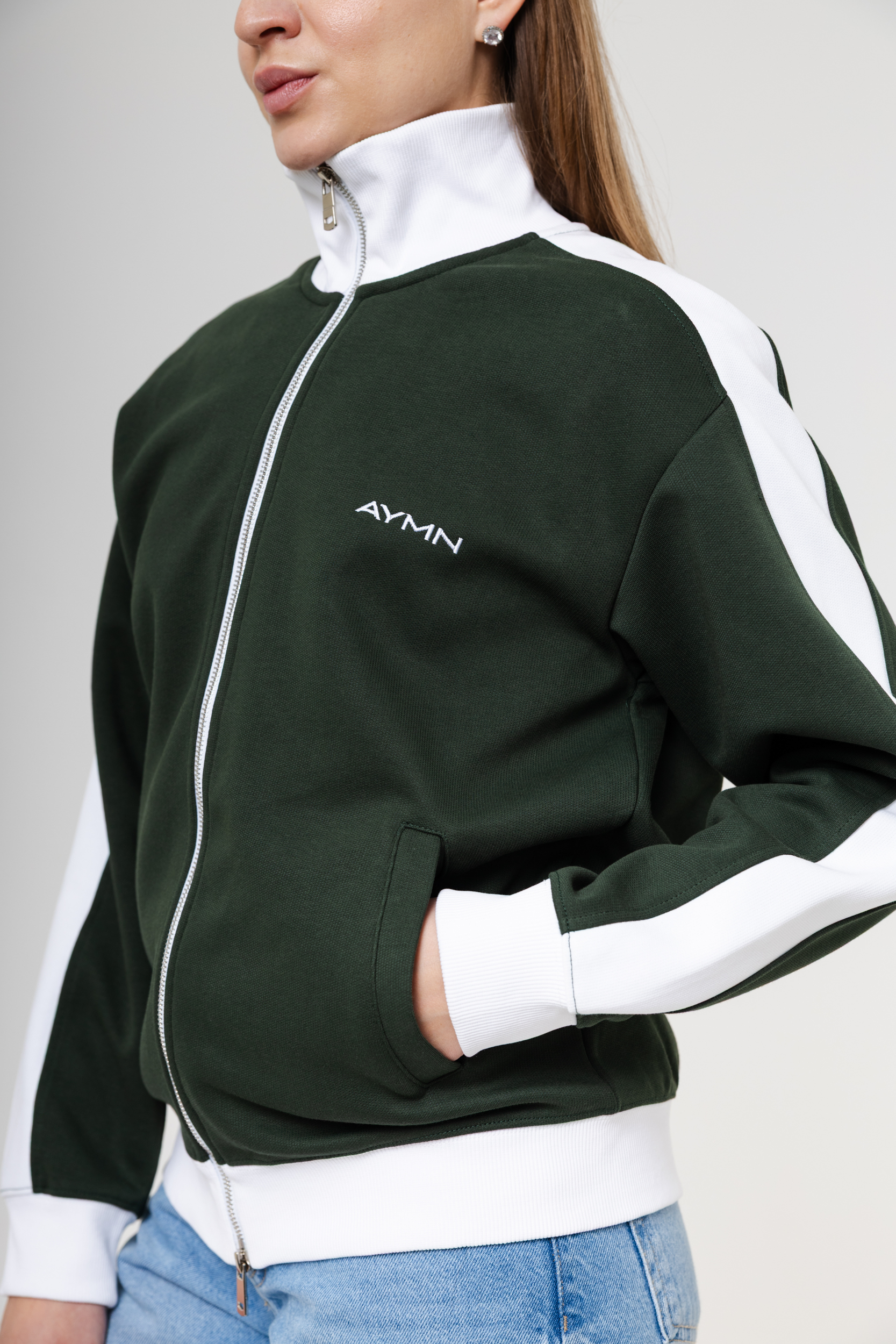 Олимпийка застёгивается на молнию и дополнена высоким воротником, защищающим от прохлады. Контрастные вставки вдоль рукавов придают образу динамичность, а лаконичный логотип AYMN подчёркивает минималистичный дизайн. Универсальный крой легко сочетается с брюками, джинсами и спортивными комплектами.