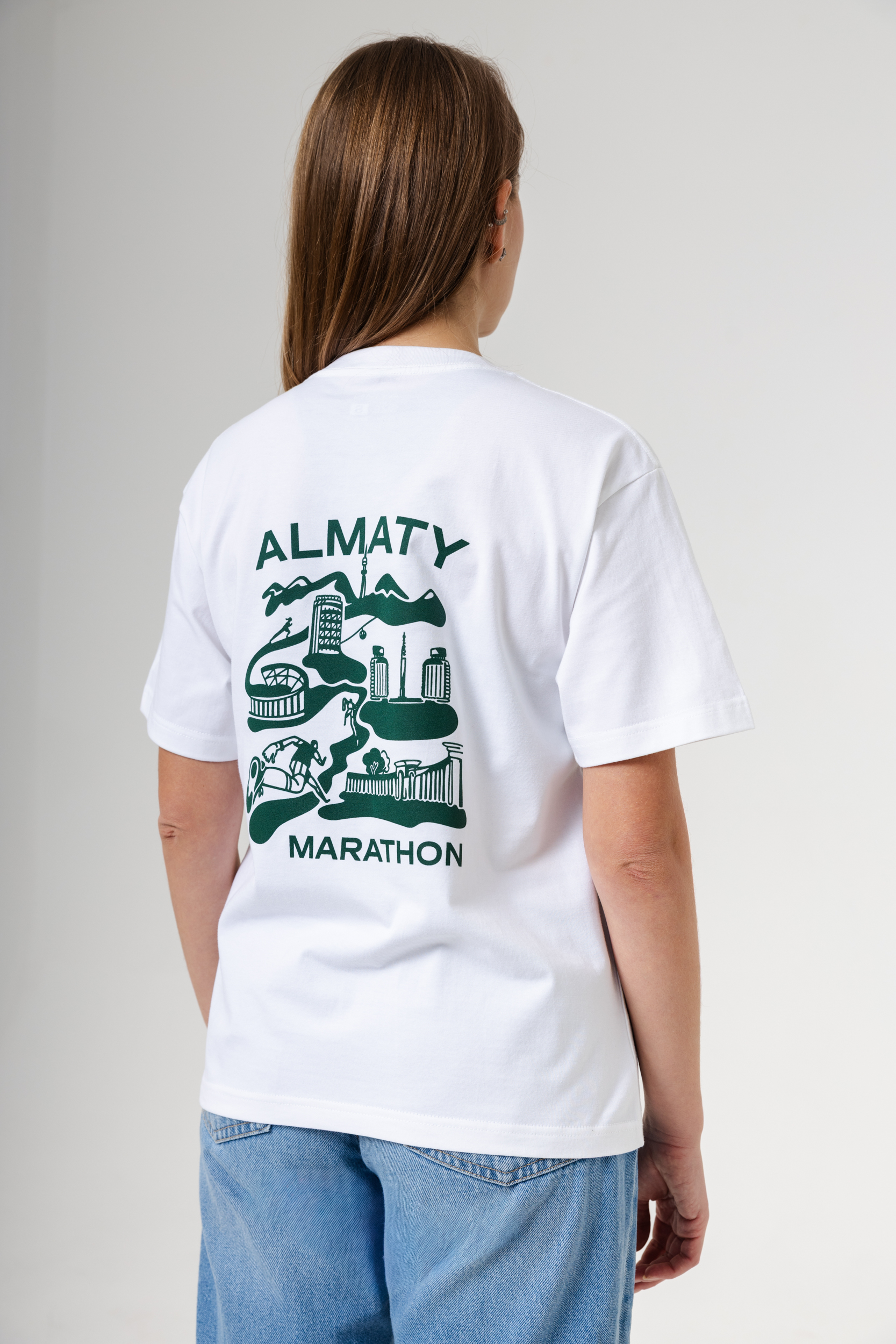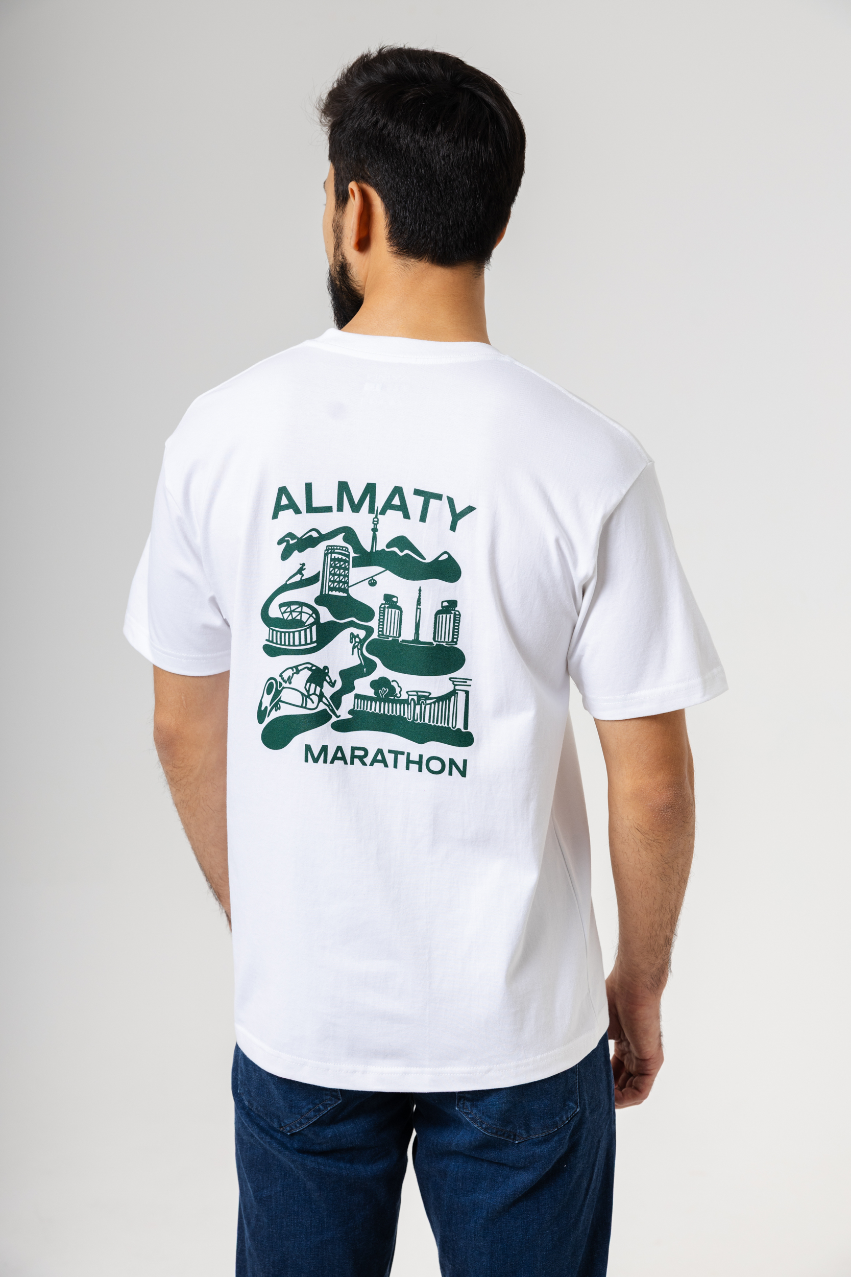 Стильная и комфортная футболка из натурального хлопка — идеальный выбор для повседневной носки и активного образа жизни. Модель выполнена в классическом белом цвете и украшена оригинальным принтом Almaty Marathon на спине, вдохновлённым городом и беговой культурой.