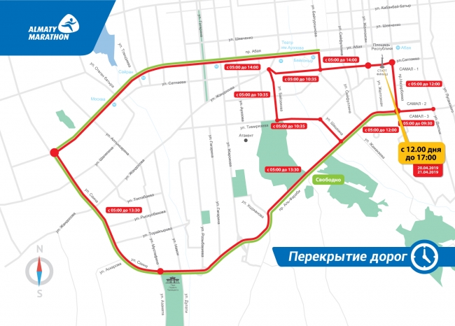 «Алматы марафоны» 2019 кезінде жолдарды жабу кестесі (20-21.04.2019)