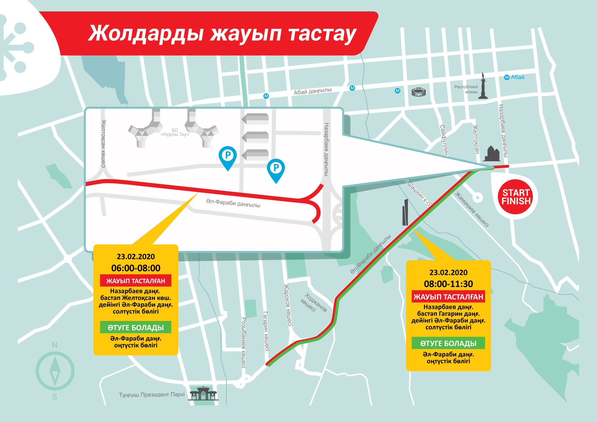Қала тұрғындары мен қонақтарын түсінікпен қарауды және 23 ақпанда Әл-Фараби даңғылы бойынша бағдарыңызды ертерек жоспарлауды сұраймыз.