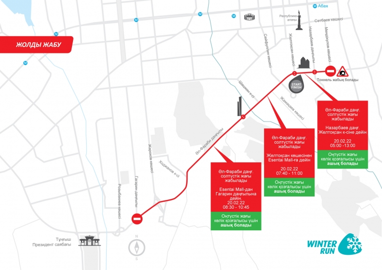 «Winter Run» 2022 жарысы (20.02.2022) үшін жолдарды жабу кестесі