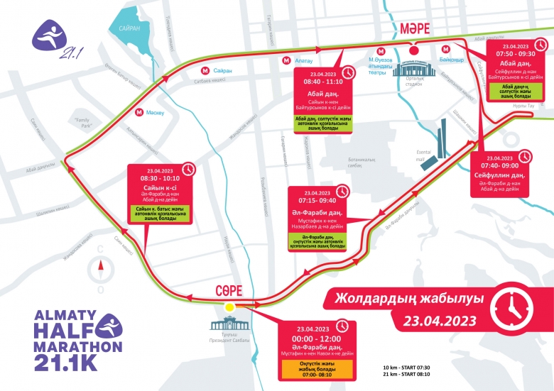 Жартылай марафон сөресі таңғы сағ. 7:30-да Тұңғыш Президент саябағында беріледі. Әл-Фараби даңғылының солтүстік жағында Мұстафин көшесінен Навои көшесіне дейінгі жол бөлігінде қозғалыс 23 сәуір күнгі сағ. 00:00-ден 12:00-ге дейін жабық болады. Оңтүстік жағы сағ. 7:00-ден 8:10-ға дейін жабық болады.