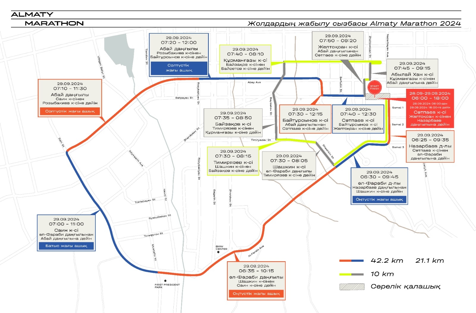 «Almaty Marathon» 2024 жолдарды жабу бойынша кесте: