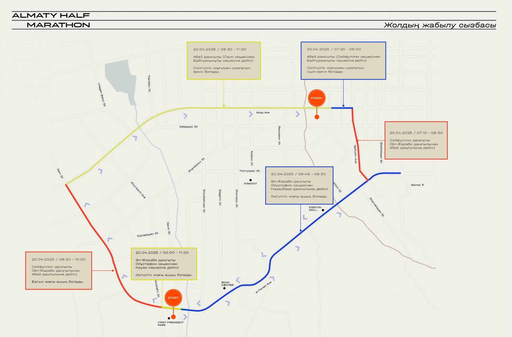 Almaty Half Marathon 2025 жарысының (20.04.2025) өтуіне байланысты жолдардың жабылу кестесі
