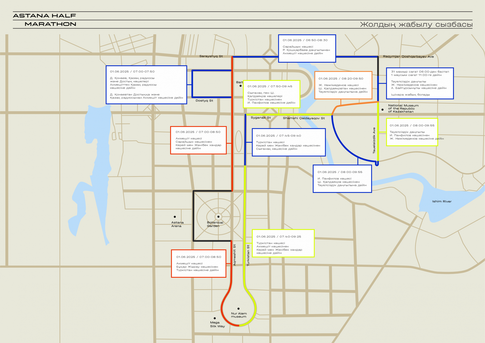 Astana Half Marathon 2025 кезінде жолдардың жабылу кестесі