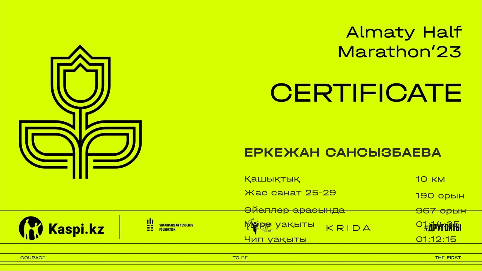 | 2607 | Kainiya Tlekenova | ![]() | Алматы | 6883 | 00:52:13.77 | 01:15:08.57 | 01:12:31.88 | Жүктеп алу |
