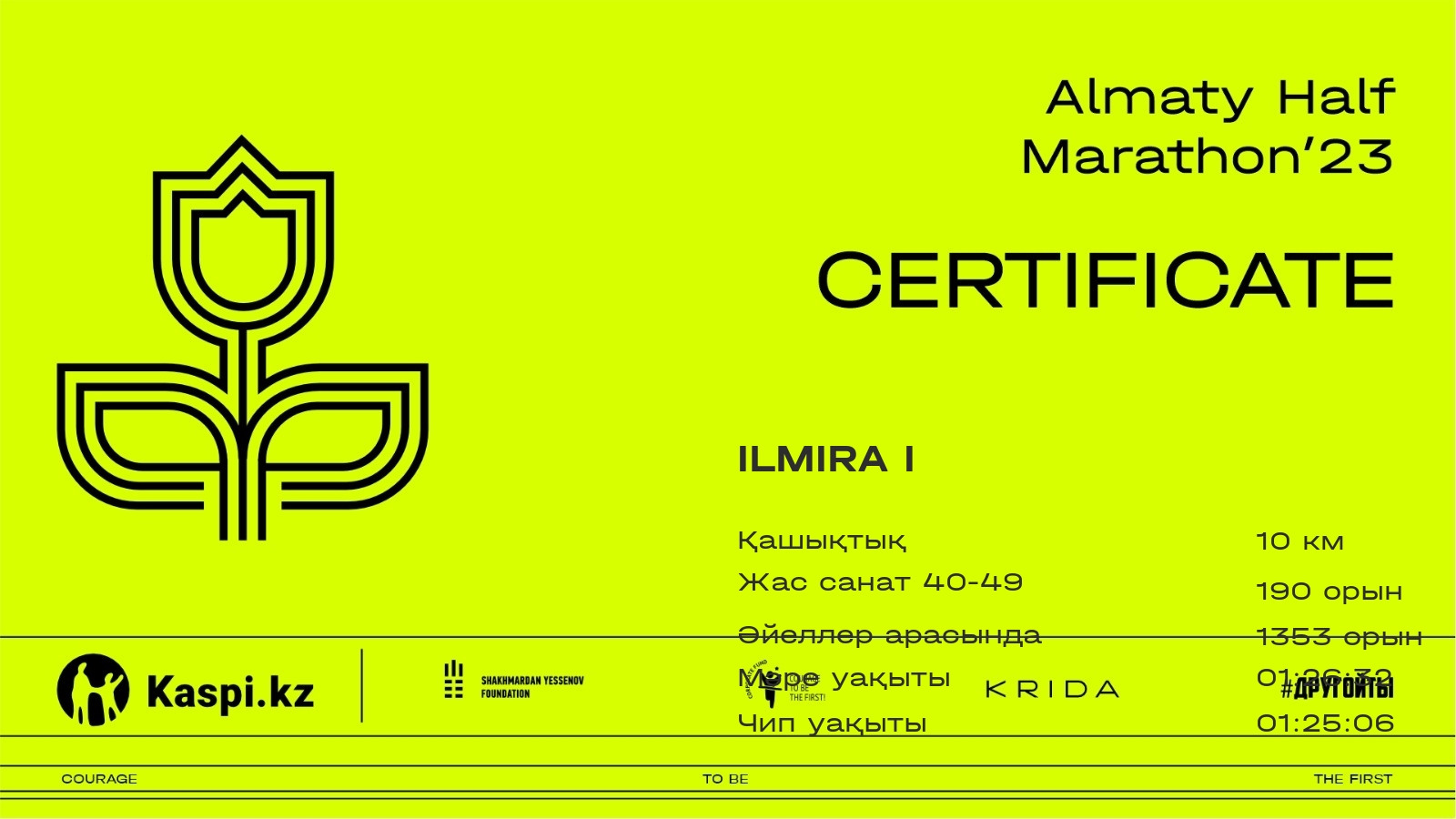 | 3121 | Сауле Мухиева | ![]() | Алматы | 5397 | 00:57:40.62 | 01:25:49.74 | 01:23:41.68 | Жүктеп алу |
