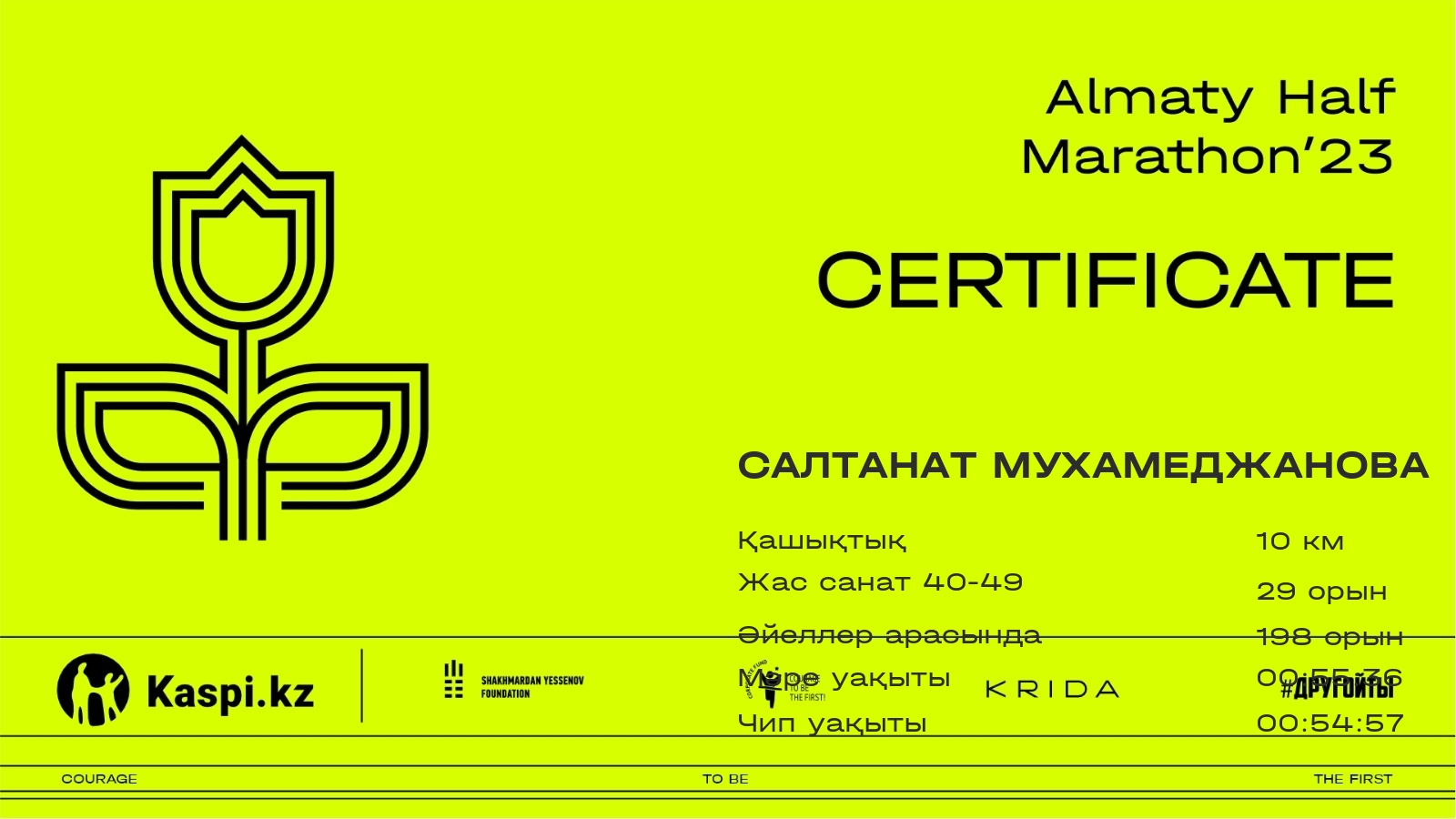 | 3354 | Самал Салимова | ![]() | Алматы | 3800 | 01:09:29.37 | 01:35:10.86 | 01:34:21.40 | Жүктеп алу |