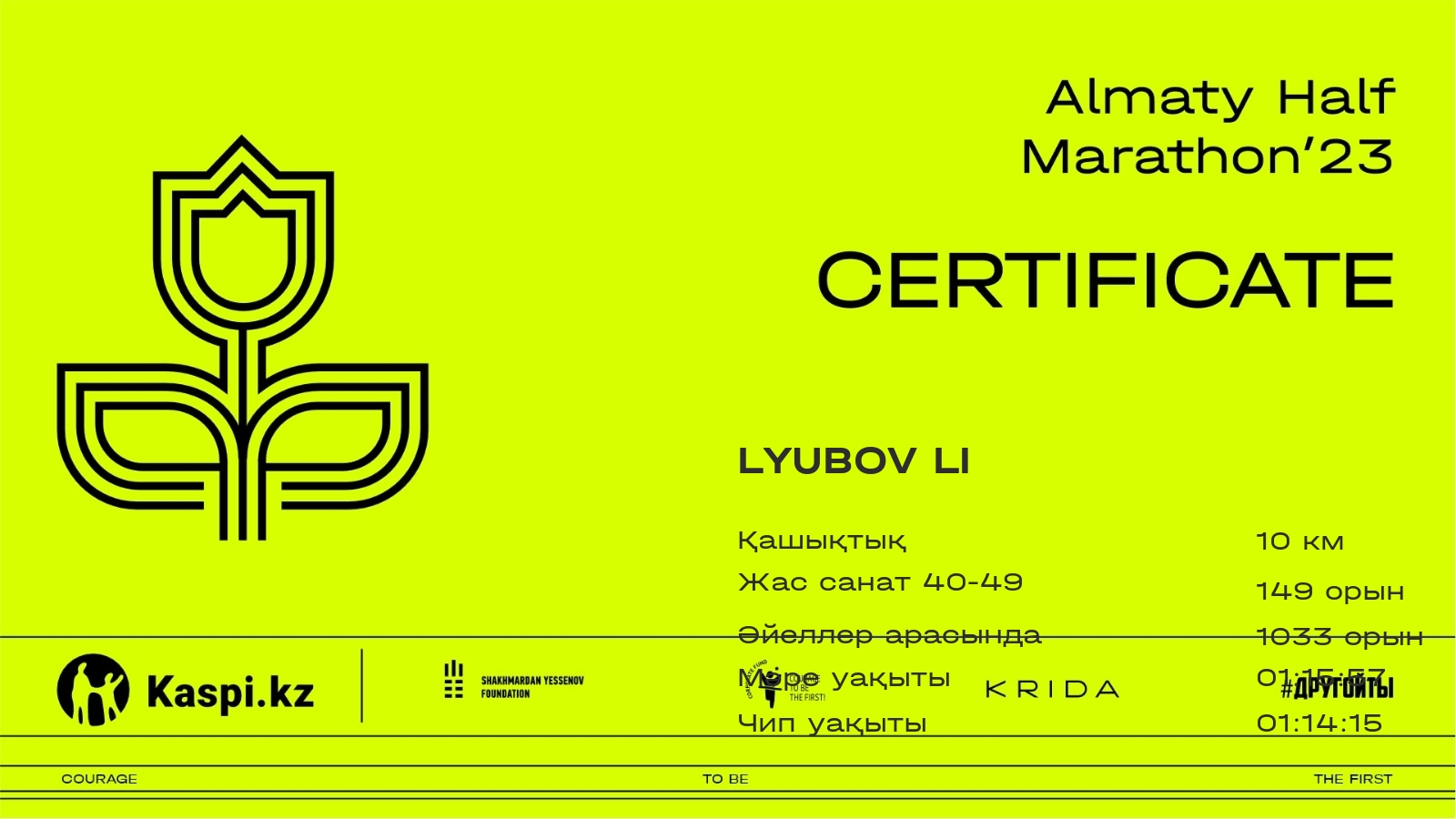| 2664 | Lyubov Li | ![]() | Алматы | 6079 | 00:51:15.20 | 01:15:57.13 | 01:14:15.92 | Жүктеп алу |