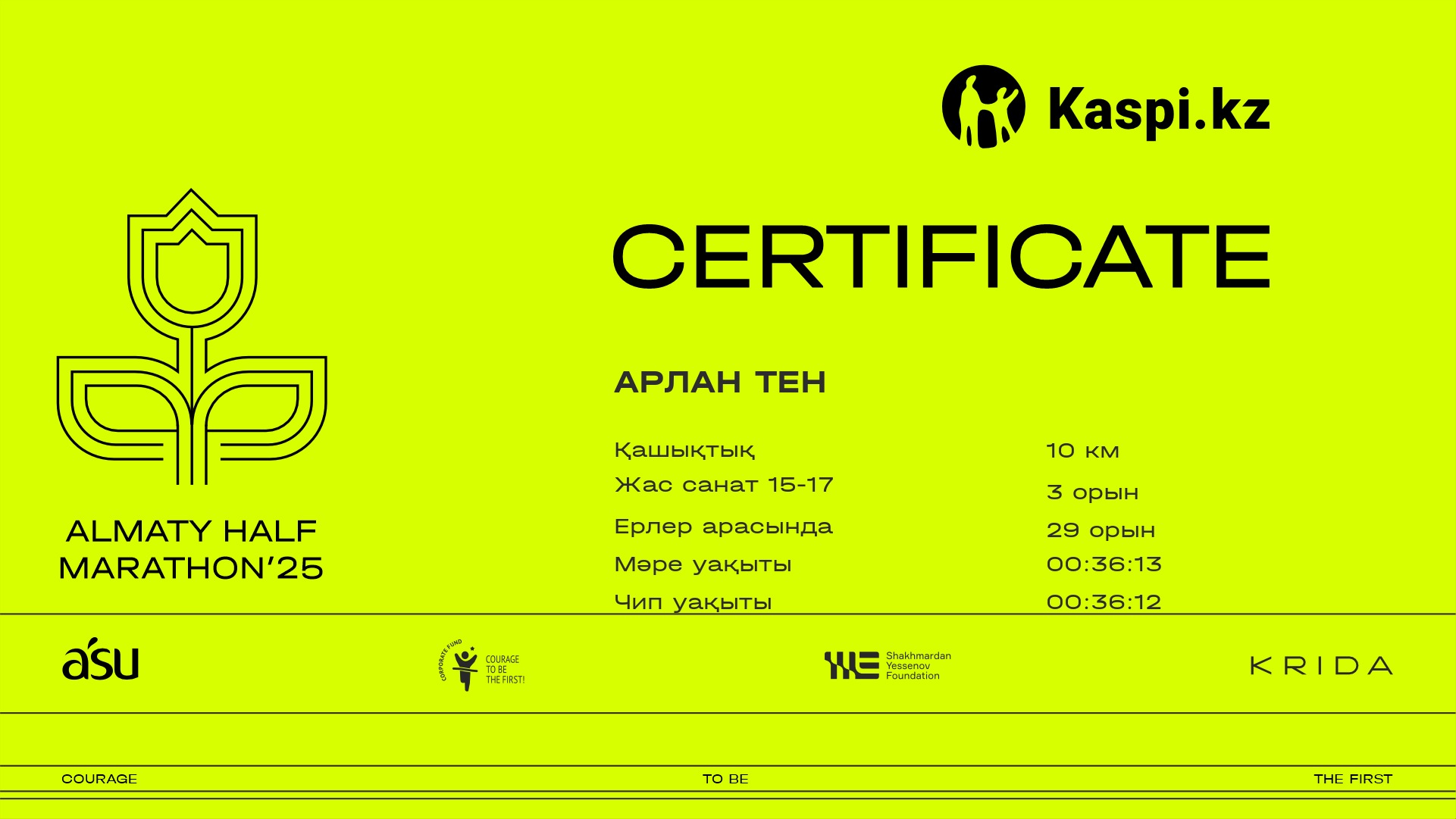 ОрынҚатысушыЕлҚалаНөмір6.5 kmФинишУақыт чипіСертификат