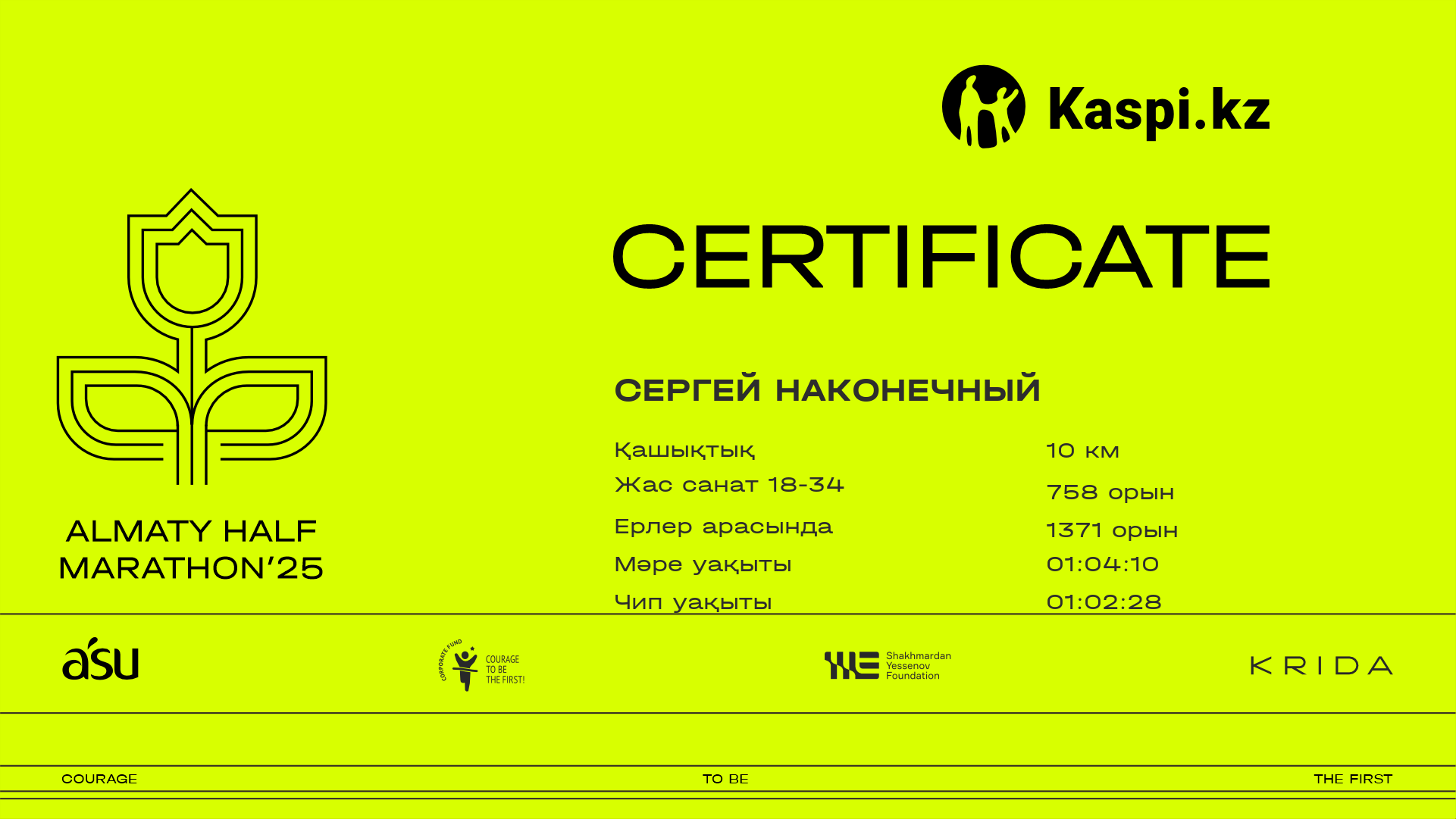 | 5025 | Дмитрий Шариков | ![]() | Алматы | 10137 | 01:10:25 | 01:48:22 | 01:46:41 | Жүктеп алу |