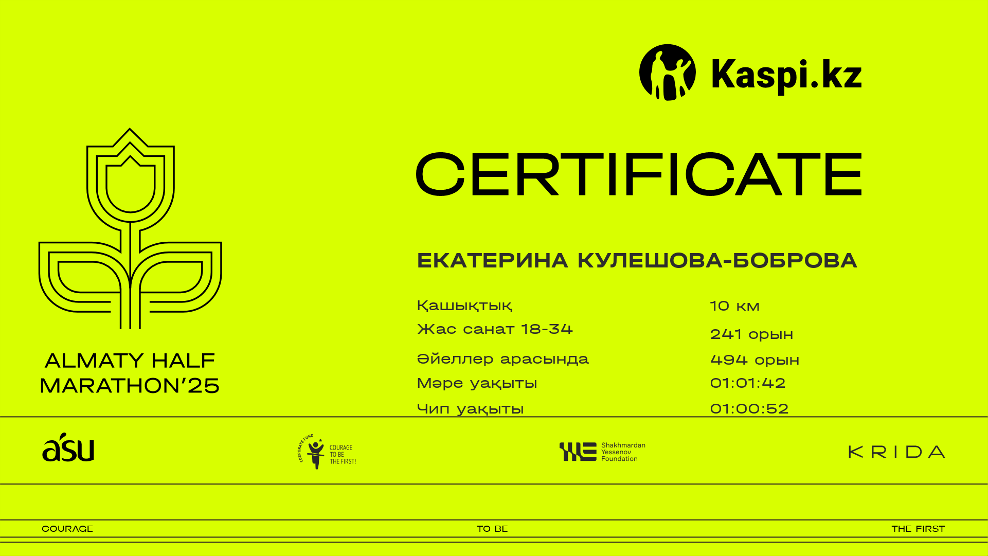 | 3068 | Динара Гимадиева | ![]() | Алматы | 5729 | 00:48:06 | 01:12:59 | 01:10:22 | Жүктеп алу |