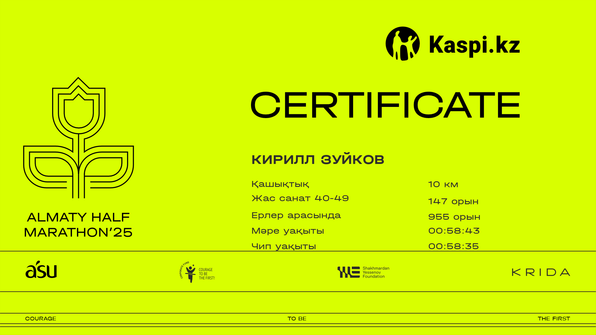 | 1143 | Ризван Иналов | ![]() | Алматы | 4525 | 00:39:00 | 00:57:26 | 00:54:06 | Жүктеп алу |