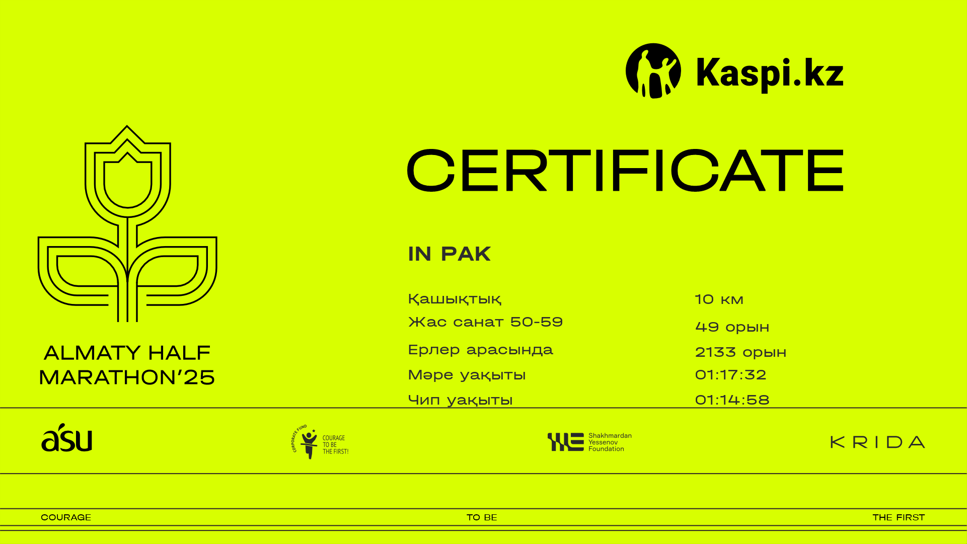 | 5067 | Назым Мурзаханова | ![]() | Алматы | 4829 | 01:10:25 | 01:52:04 | 01:49:24 | Жүктеп алу |