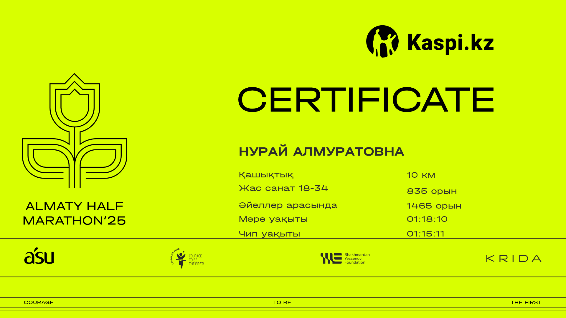 | 4559 | Салтанат Кубисенова | ![]() | Алматы | 8787 | 01:01:18 | 01:30:55 | 01:26:03 | Жүктеп алу |