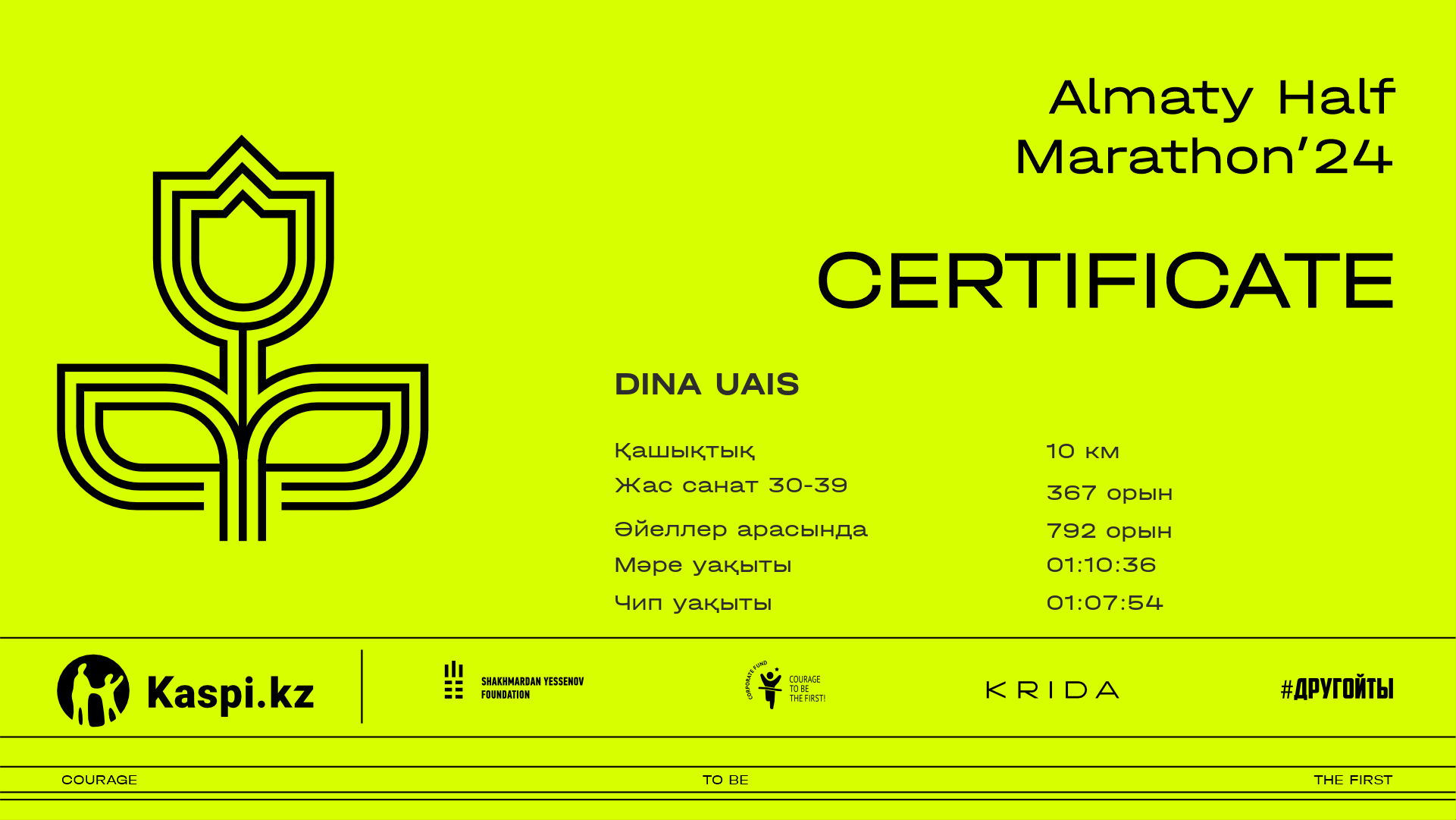 | 3134 | Adina Azhikenova | ![]() | Алматы | 4005 | 00:56:02 | 01:19:40 | 01:19:23 | Жүктеп алу |