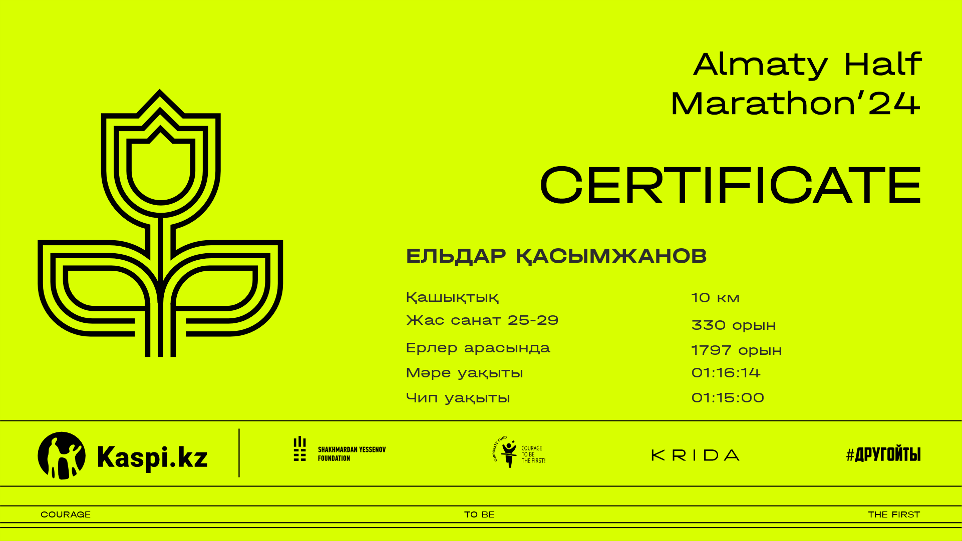 | 3923 | Дмитрий Весёлкин | ![]() | Алматы | 3766 | 01:13:46 | 01:48:14 | 01:45:07 | Жүктеп алу |