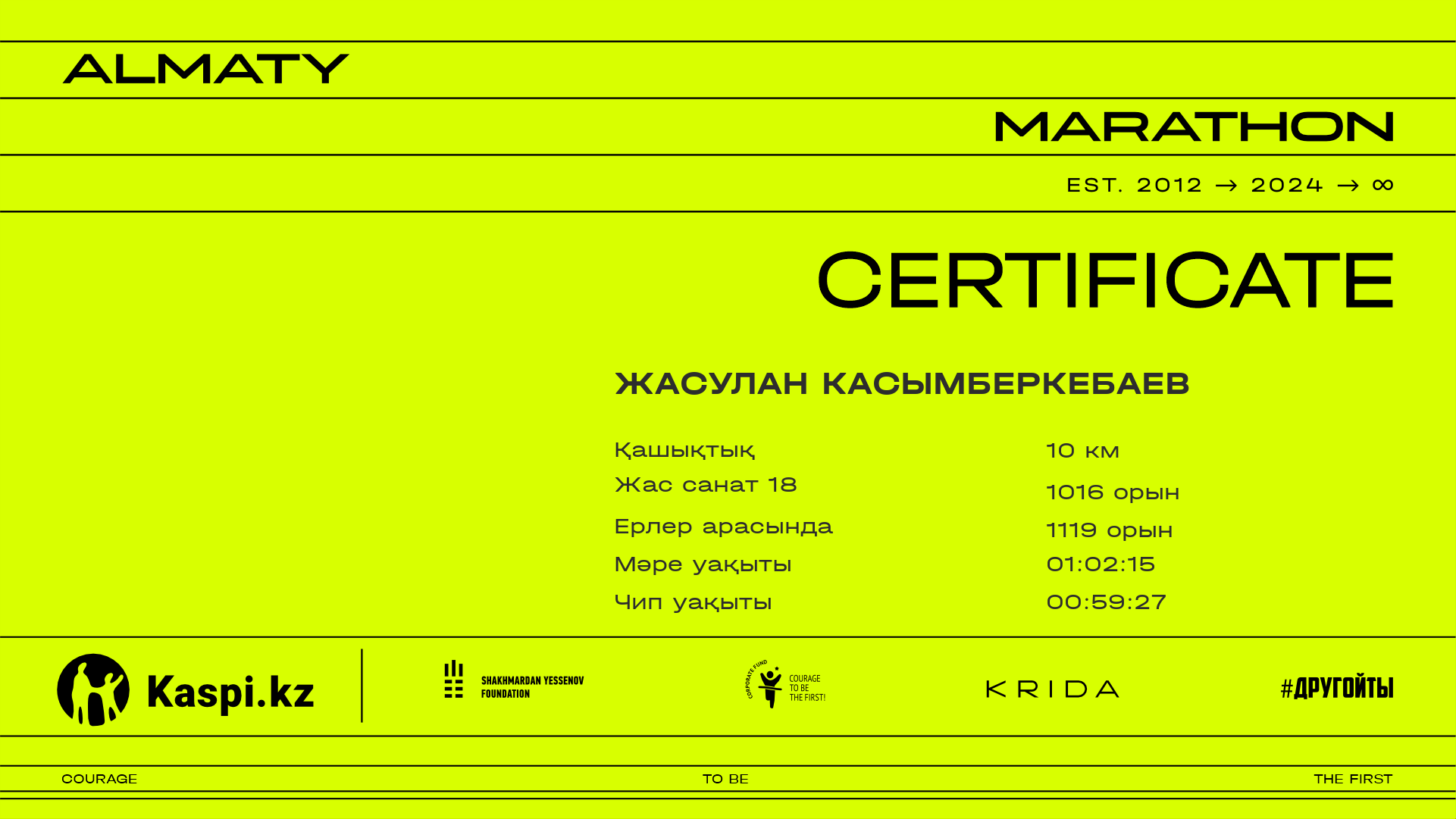 | 1595 | Аскар Жумагулов | ![]() | Алматы | 8716 | 00:46:37.61 | 01:04:04.53 | 01:03:47.78 | Жүктеп алу |