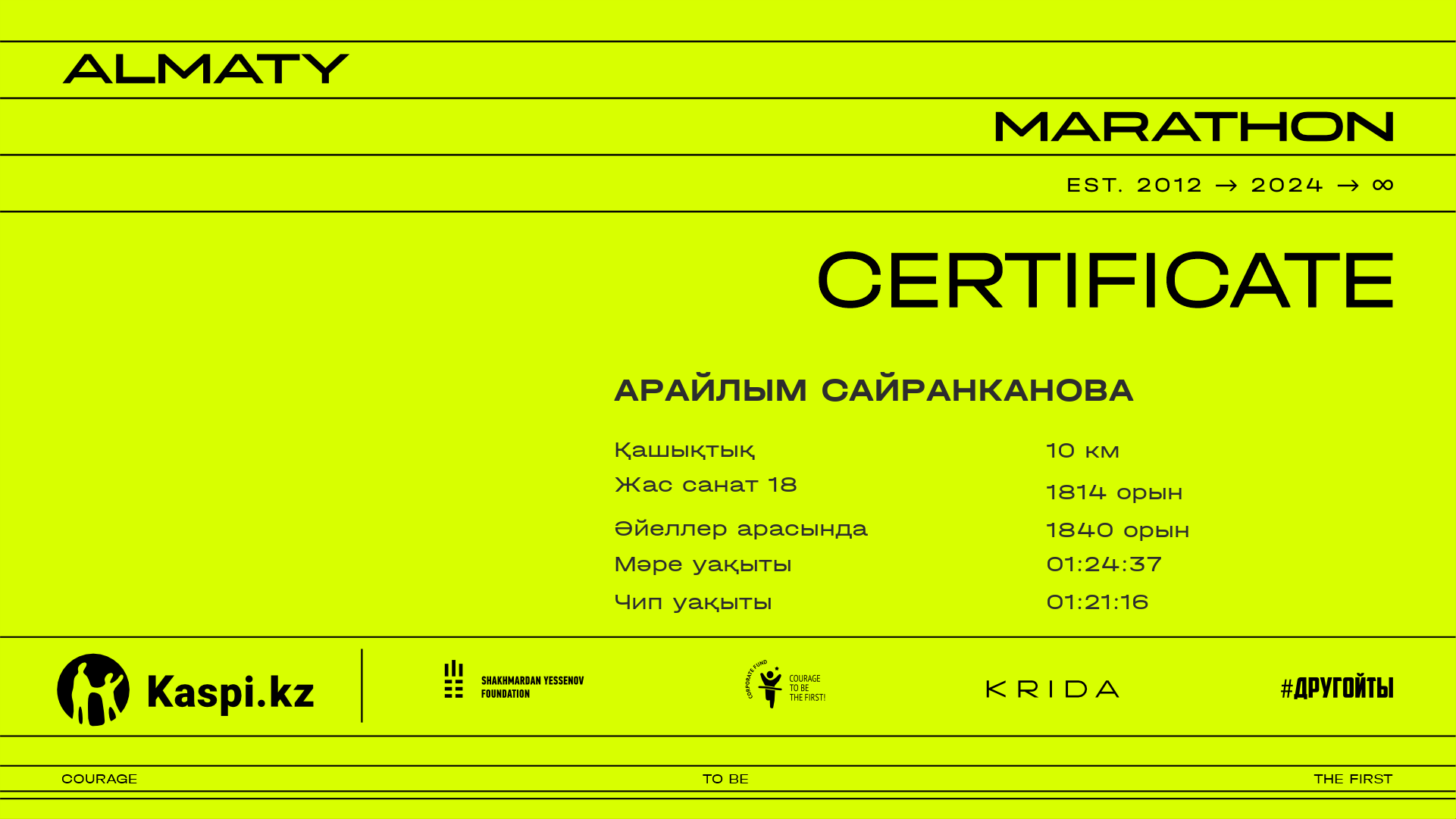 | 4712 | Айша Жаркынбек | ![]() | Алматы | 7882 | 01:04:57.68 | 01:28:02.97 | 01:26:05.81 | Жүктеп алу |