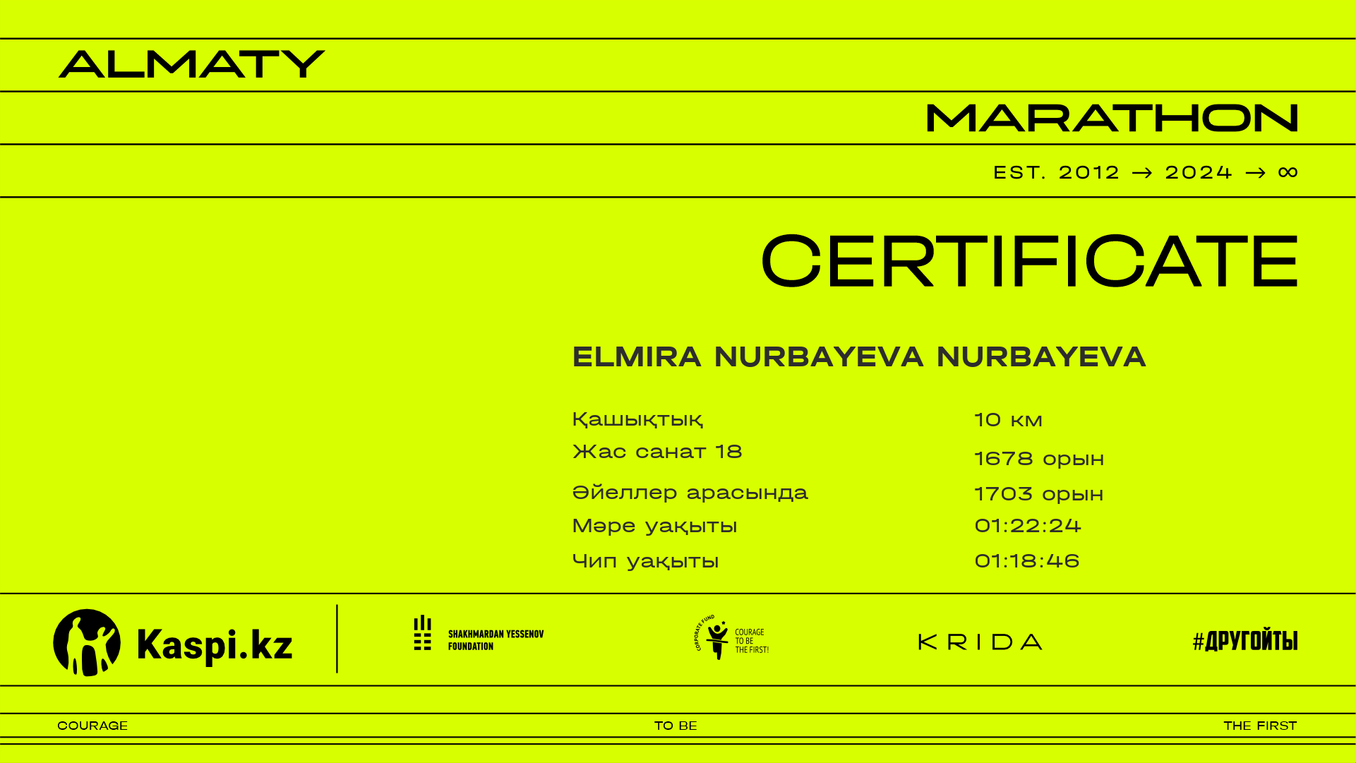 | 4193 | Elmira Nurbayeva Nurbayeva | ![]() | Almaty | 7250 | 01:02:17.30 | 01:22:24.37 | 01:18:46.31 | Жүктеп алу |