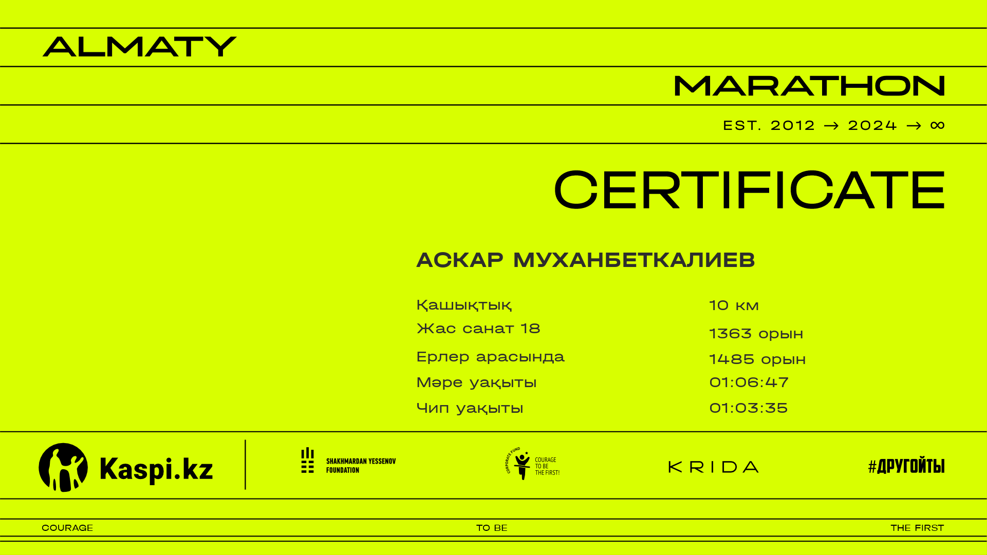 | 4386 | Азамат Болатулы | ![]() | Алматы | 10828 | 01:03:30.74 | 01:24:23.13 | 01:24:23.13 | Жүктеп алу |
