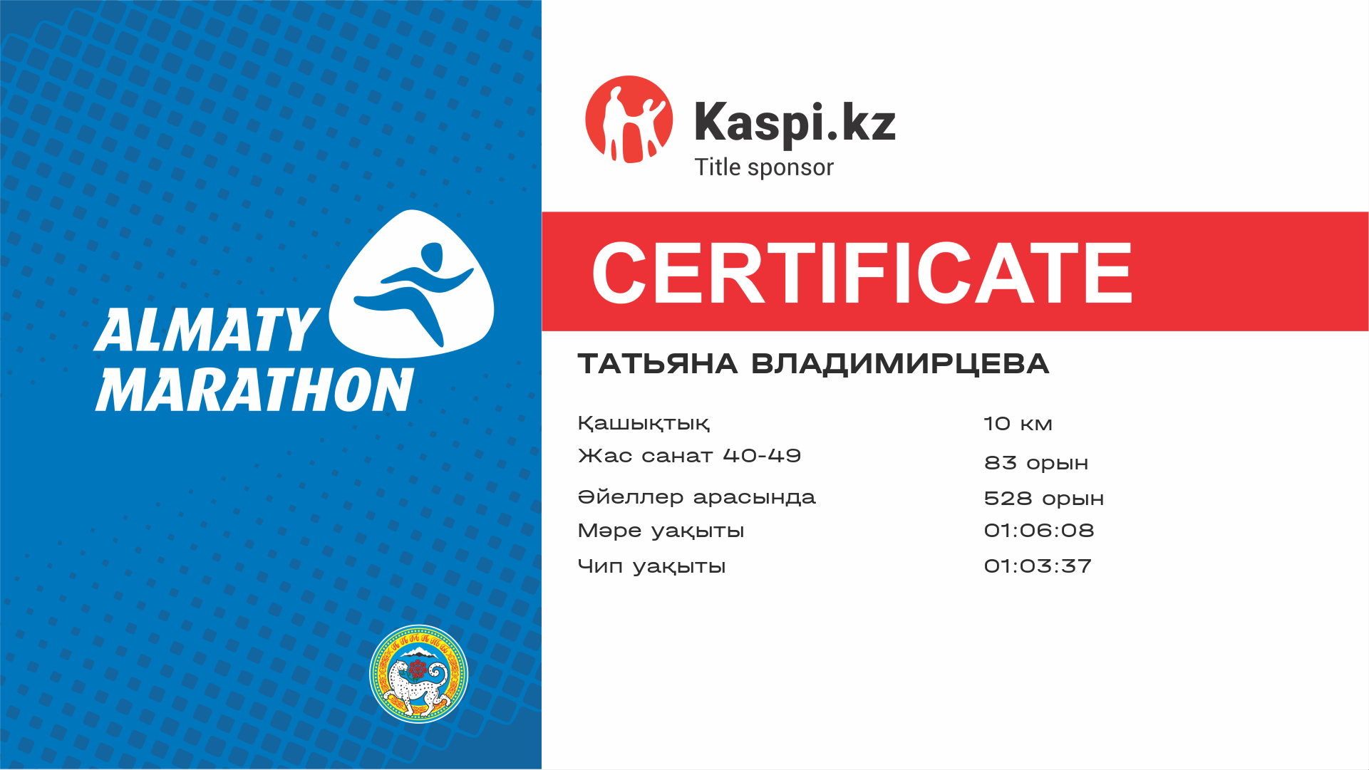 | 6236 | Татьяна Лукашук | ![]() | Алматы | 12852 | 01:07:01 | 01:31:39 | 01:30:43 | Жүктеп алу |