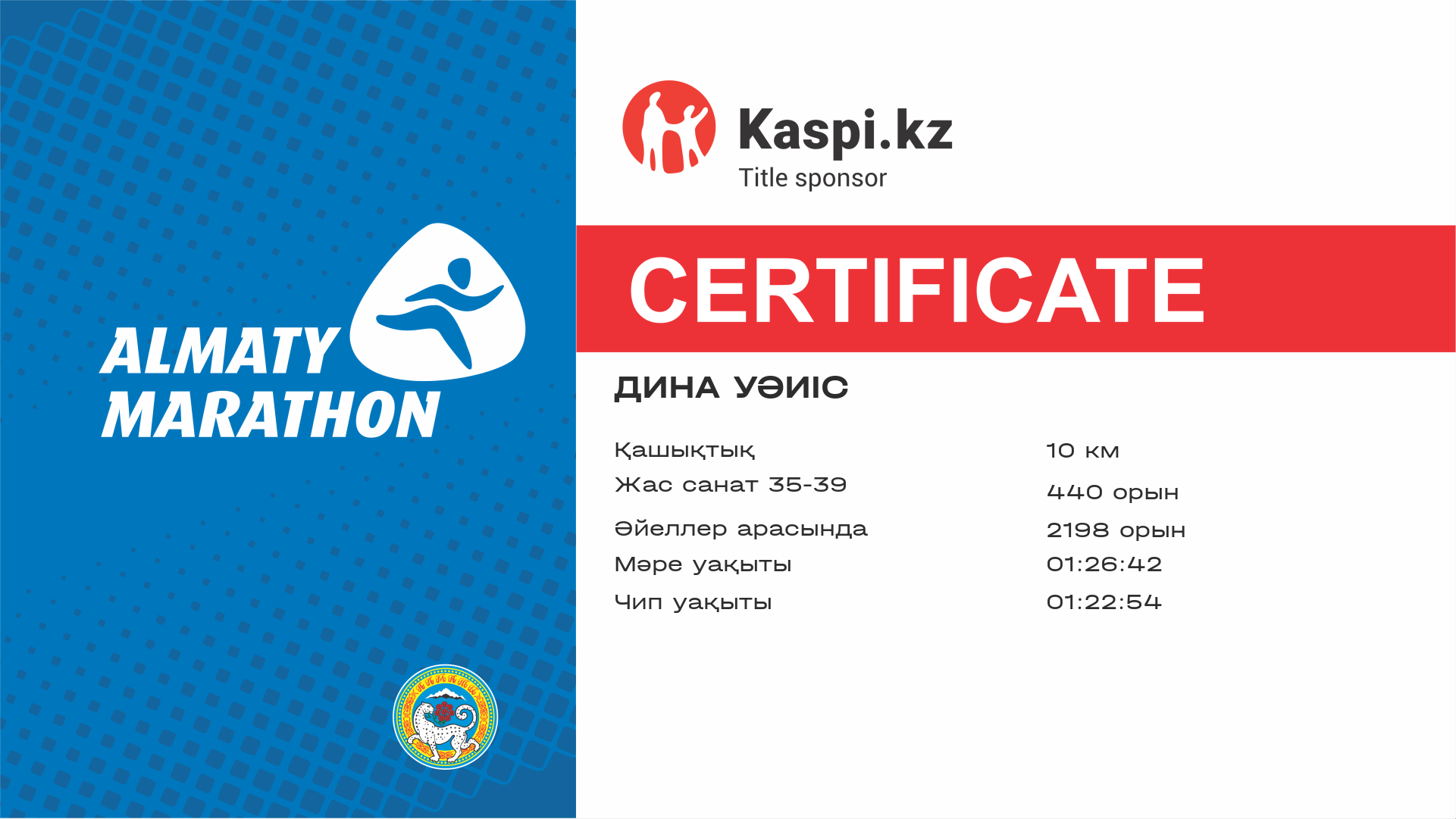 | 5784 | Айгерим Саменова | ![]() | Almaty | 10822 | 01:03:30 | 01:26:47 | 01:23:00 | Жүктеп алу |