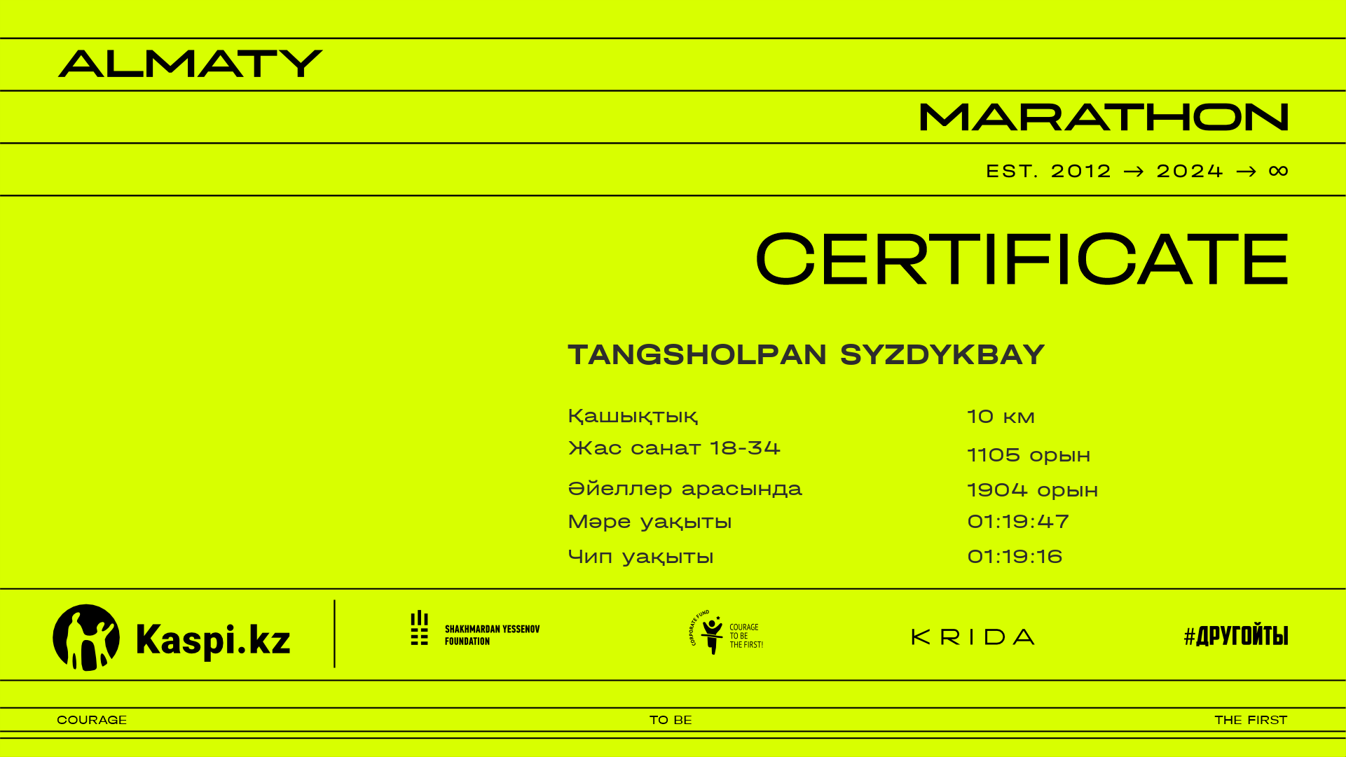 | 6028 | Андрей Ким | ![]() | Алматы | 11046 | 01:14:16.37 | 01:23:50.66 | 01:19:20.30 | Жүктеп алу |