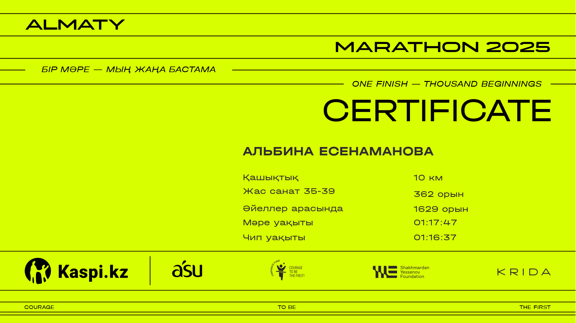 | 6432 | Amina Sagyntay | ![]() | Алматы | 10575 | 01:24:34 | 01:37:26 | 01:36:09 | Жүктеп алу |